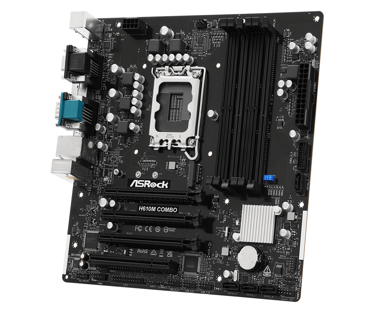 Najnowsza płyta ASRock H610M Combo otrzymała sześć gniazd DIMM podzielonych nierównomiernie. Para slotów przeznaczona jest dla modułów DDR4 o pojemności do 64 GB i prędkościach do 2666 MT/s. Pozostałe cztery obsługują pamięci DDR5 do 96 GB i 4800 MT/s. Konstrukcja wygląda jak eksperyment laboratoryjny, lecz mimo pozornego miksu standardów wybór nadal jest zero-jedynkowy. System wystartuje wyłącznie na jednym typie pamięci, a nie na ich kombinacji. Dla osób, które chcą przejść na nowszy procesor, ale ceny DDR5 są zaporowe, taka płyta może być świetnym rozwiązaniem na przeczekanie tego szaleństwa.