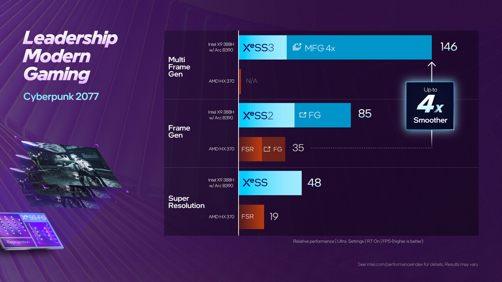 Dużą rolę w tym sukcesie odgrywa nowe XeSS3, czyli najnowsza odsłona technologii skalowania obrazu Intela. Producent intensywnie współpracuje z twórcami gier, aby wsparcie dla XeSS3 było dostępne od dnia premiery. Cyberpunk 2077 obsługuje je natywnie, co przekłada się na nawet trzykrotny wzrost liczby klatek na sekundę w porównaniu do XeSS2. Intel idzie też o krok dalej, porównując się bezpośrednio z NVIDIĄ. Według deklaracji firmy XeSS3 wypada lepiej niż DLSS w przypadku kart takich jak RTX 4050, głównie dlatego, że obsługuje generowanie wielu klatek, czego ta karta NVIDII nie oferuje.