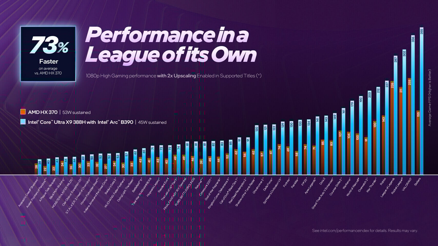 Intel przekonuje, że nie mamy tu do czynienia z jednorazowym wyjątkiem. W wewnętrznych testach producenta Panther Lake okazuje się średnio o 73% szybszy od „Strix Point” przy użyciu technologii skalowania obrazu oraz aż o 82% szybszy przy renderowaniu w natywnej rozdzielczości. W praktyce oznacza to, że w niektórych grach Arc B390 potrafi generować nawet blisko dwa razy więcej klatek na sekundę niż Radeon 890M.