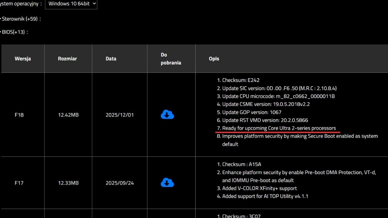 Zagłębiając się w szczegóły, nowa wersja BIOS została wypuszczona dla płyt głównych z chipsetem Z890. Między innymi aktualizuje ona mikrokod do wersji m_82_c0662_0000011B. Jednocześnie w opisie możemy przeczytać „Gotowy na nadchodzące procesory Core Ultra serii 2”. Jak widać nie padła zatem jednoznacznie nazwa Core Ultra 200S Plus. Ciężko jednak nie wywnioskować z dotychczasowych doniesień i plotek, że to właśnie o tę serię chodzi.