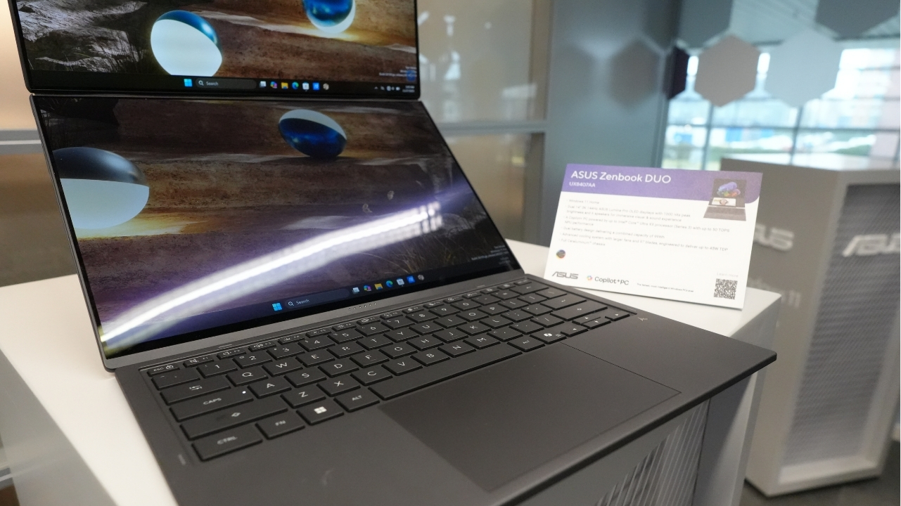 Idąc dalej, nowy Zenbook Duo ma do zaoferowania najnowszą generację procesorów znaną jako Panther Lake (Core Ultra Series 3). Do tego nawet 32 GB RAM, maksymalnie 2 TB SSD i bateria 99 Wh. ASUS zaznaczył również nowy projekt zawiasów, więc i w tym zakresie możemy oczekiwać poprawy. Znajdziemy tutaj również szereg portów z dwoma Thunderbolt 4, złączem jack, HDMI 2.1 oraz USB 3.2 Gen 2 typu A. Wszystko to przy zachowaniu 1,65 kg wagi.