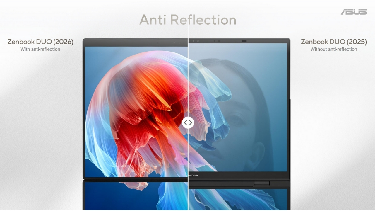 Ciężko ukryć, że ASUS lubi tworzyć laptopy z dwoma ekranami. Oprócz gamingowego modelu na rok 2026 zobaczyliśmy też najnowszego Zenbooka Duo. Do jego głównych cech możemy zaliczyć antyrefleksyjną powłokę ekranów, co stanowi zmianę względem modelu z 2025 roku. Do tego wzrost głośności o 125% dzięki 6 głośnikom, w tym dwóm od frontu.