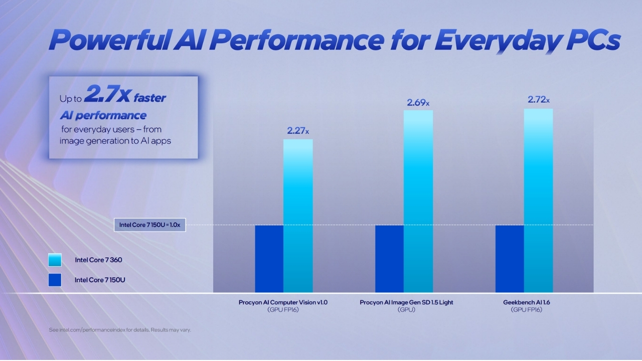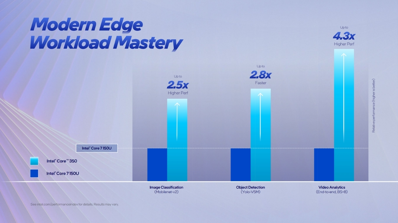 Według Intela nowe układy oferują nawet do 47% lepszą wydajność jednowątkową, 41% w wielowątkowej oraz nawet 2,8x wyższą wydajność AI GPU względem starszych, kilkuletnich konstrukcji.