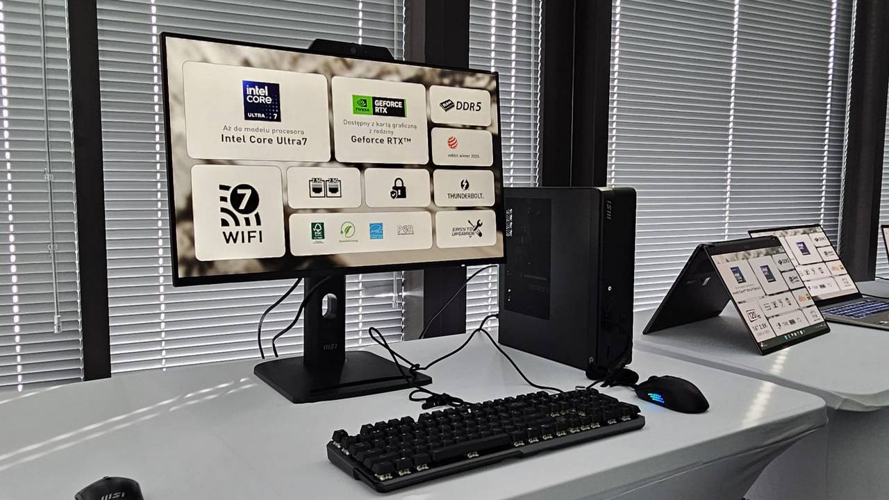 Na osobnym stanowisku stał mały komputer stacjonarny MSI Cubi, Podłączony był do dwóch monitorów: dużego MSI PRO MAX 271UPXW12G (27-calowy ekran z rozdzielczością 4K), z panelem IPS, złączem HDMI, Thunderbolt, certyfikatem VESA i obsługą Eyes Ergo. Jest to zdobywca nagrody Good Design Award 2025. Drugi ekran to przenośny monitor MSI idealny do używania jako dodatkowy wyświetlacz.