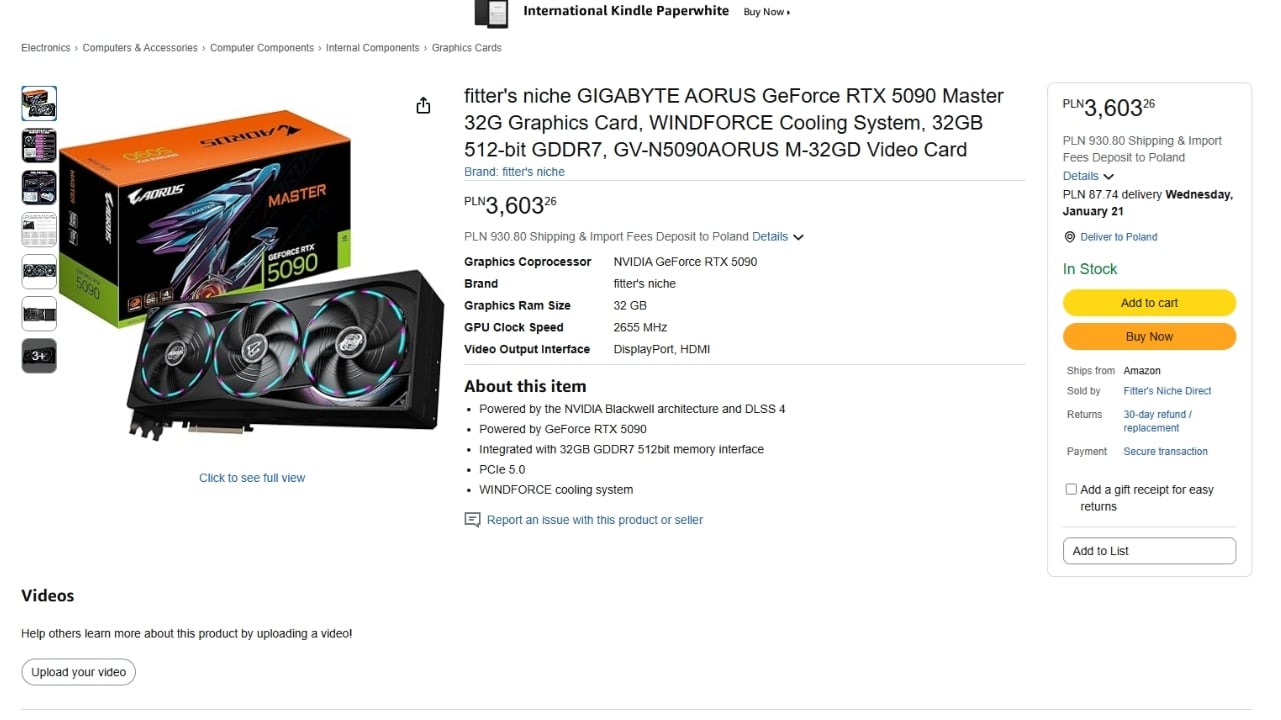 W serwisie Amazon znajduje się wyjątkowa oferta na kartę graficzną GeForce RTX 5090. Jej unikatowość sprowadza się do ceny, która wynosi zaledwie 999 dolarów. W przeliczeniu na złotówki wychodzi ciut ponad 3600 zł. Od razu przypomnijmy, że oficjalna wycena NVIDII dla tego modelu to 1999 dolarów, a w Polsce 9100 zł. W praktyce jednak najtańszy RTX 5090 w Newegg kosztuje 3695 dolarów, a w x-kom 15499 zł. Skąd zatem tak niska kwota w tej ofercie na Amazonie?