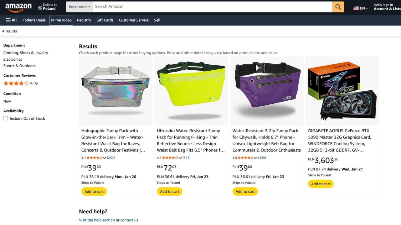 Zaskakująco dużo klientów uwierzyło w możliwość zakupu karty graficznej po kosztach. Jak można się domyślać, wszystko okazało się oszustwem, a klienci zamiast kart otrzymali… saszetki biodrowe. Sprzedawca może w ten sposób wykorzystywać mechanizm realizacji zamówień przez Amazon.