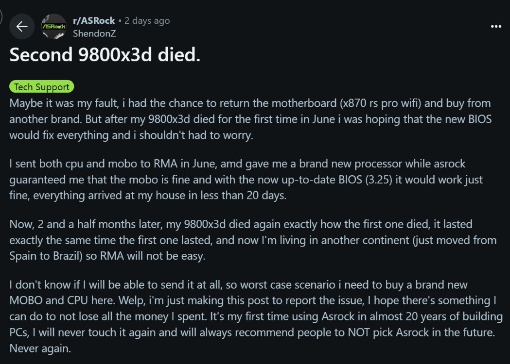 Użytkownik ShendonZ podzielił się nieszczęśliwą historią swojego komputera. Wszystko zaczyna się od zakupu procesora Ryzen 7 9800X3D i płyty głównej ASRock X870 RS Pro WiFi. W czerwcu, po dwóch i pół miesiąca użytkowania, jego procesor niespodziewanie padł.
