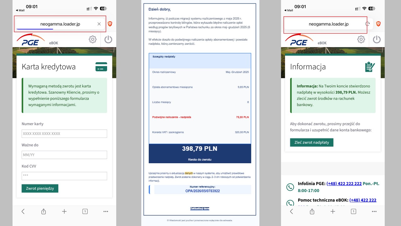 Schemat ataku jest wieloetapowy. Pierwsza wiadomość naśladuje komunikację PGE i nie wzbudza podejrzeń, zwłaszcza gdy przeglądamy skrzynkę w pośpiechu. Po kliknięciu w przycisk „Zaktualizuj dane" ofiara trafia na fałszywą stronę logowania imitującą panel klienta PGE. Tam zostaje poproszona o dane logowania, a następnie (po rzekomym zalogowaniu) o podanie numeru karty płatniczej, daty ważności oraz kodu CVV/CVC pod pretekstem zlecenia zwrotu nadpłaty.