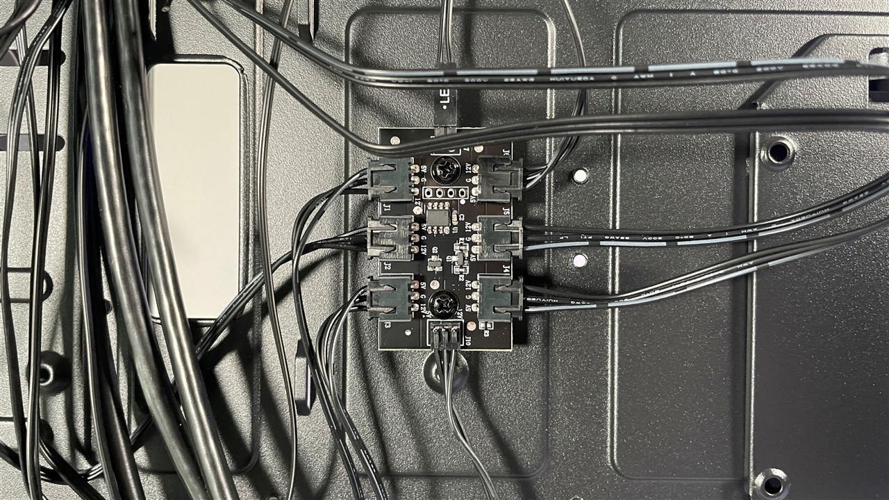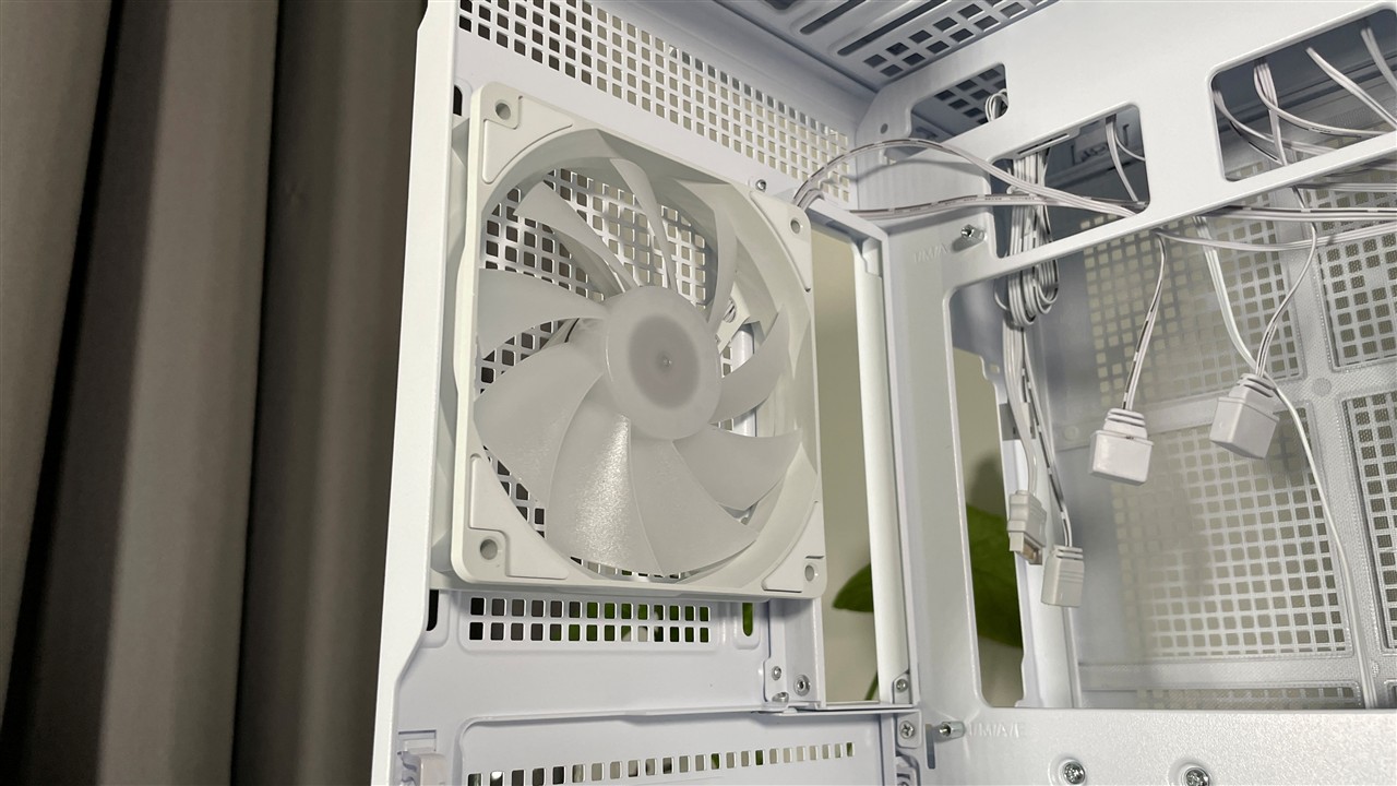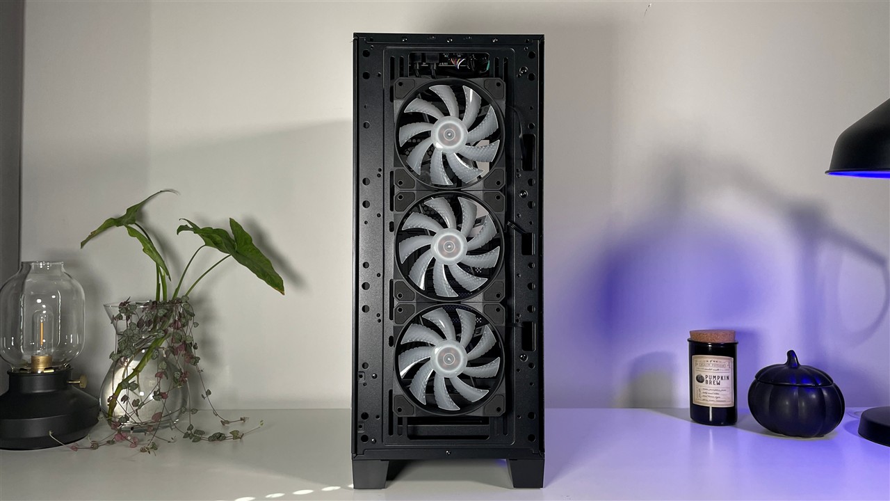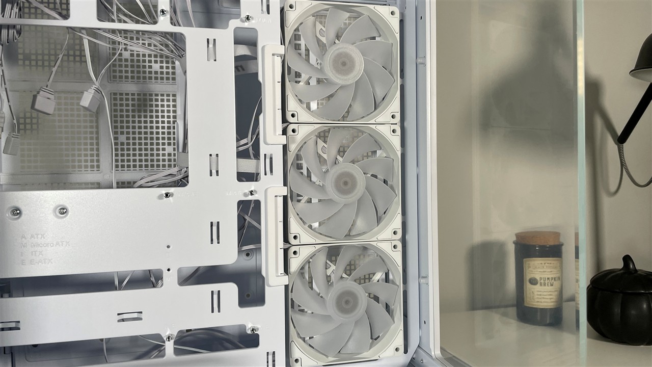 Pano 100R PZ przychodzi z czterema wentylatorami w rozmiarze 120 mm. Każdy ma podświetlenie ARGB i jest wpięty do fabrycznego kontrolera. Należy podkreślić, że trzy z nich - te które znajdują się na boku - mają odwrócone łopatki, co w praktyce oznacza, że przy domyślnym montażu wyciągają powietrze z wnętrza, a nie je tłoczą.