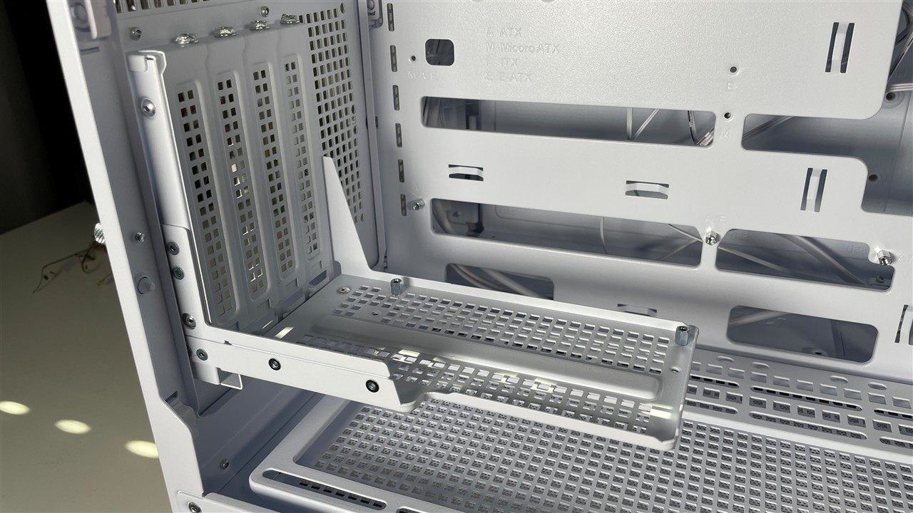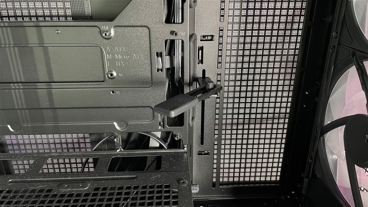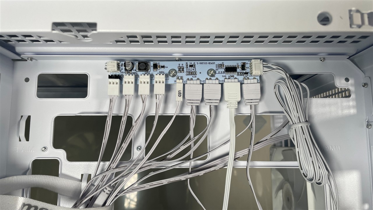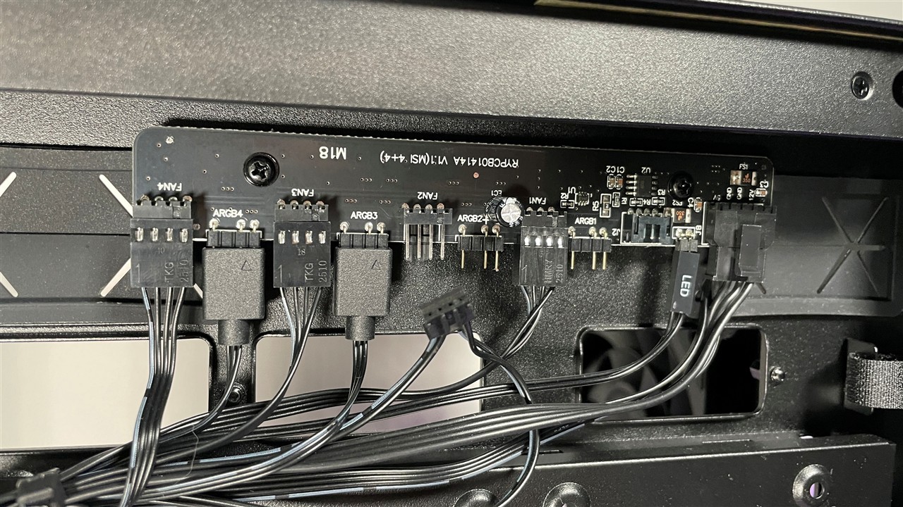 Wracając jeszcze do tematu chłodzenia, ten model już fabrycznie wyposażono w trzy wentylatory. I to nie byle jakie. Dwa przednie mają rozmiar 160 mm, posiadają fizyczny przełącznik do zmiany prędkości i podświetlenie ARGB. Ten z tyłu ma natomiast rozmiar 120 mm. I nie brakuje też kontrolera z czterema złączami pod wentylatory i taką samą liczbą złączy pod ARGB.