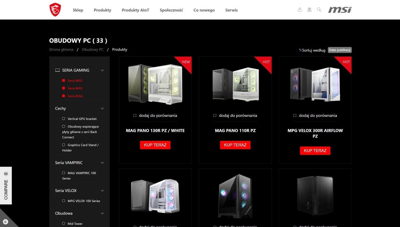 Kategorię „obudowy” w asortymencie MSI podzielono na trzy serie produktów: MEG, MPG oraz MAG. Najmniej obszerną z nich jest MEG, w ramach której dostępne są tylko 2 modele: Maestro 700L PZ oraz Prospect 700R. Dużo więcej, bo aż 13 modeli, znajdziemy w linii MPG - to właśnie w tej kategorii znajdziemy takie konstrukcje, jak Gungnir 300R Airflow, Velox 100R czy Sekira 100P. Całość domyka nam linia produktów MAG, w której znajdziemy imponujące 18 modeli, m.in. Pano 100R PZ, Forge 120A Airflow czy Vampiric 300R.