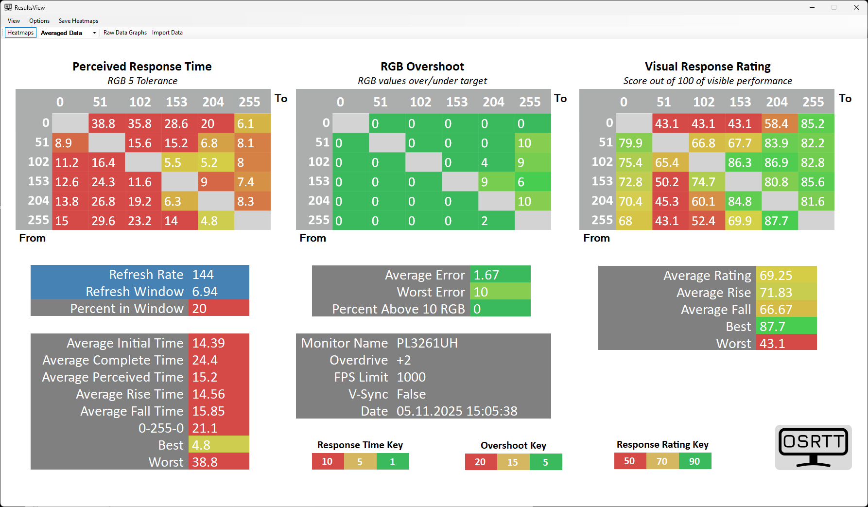 Opóźnienia wejściowe, zwane input lag, to także mocna strona monitora. Do pomiaru tego parametru wykorzystujemy proste urządzenie OSRTT, które świetnie sprawdza się w tej roli, gdyż służy właśnie do pomiaru opóźnienia między wydaniem przez nas polecenia a reakcją widoczną na ekranie monitora. Co jednak istotne w tym przypadku, LDAT potrafi zmierzyć opóźnienia samego wyświetlacza. iiyama G-Master GB3261UHSCP-B1 Red Eagle uzyskała 3,4 ms, co jest bardzo dobrym wynikiem.