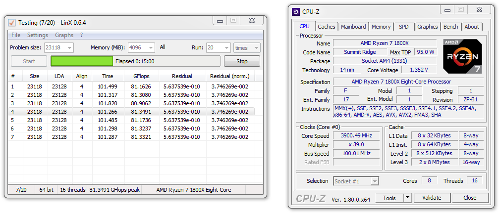W przypadku droższego modelu, czyli Ryzen 7 1800X, poszło nieznacznie lepiej. Najwyższą wartością, przy której komputer był w pełni stabilny, okazało się 3,9 GHz przy napięciu ustawionym ponownie na 1,35 V. Jest to więc rezultat lepszy o dokładnie 100 MHz od pierwszego ośmiordzeniowca, co w sumie nie powinno dziwić, bowiem w przypadku wyższych modeli szansa na uzyskanie lepszych ustawień po prostu rośnie. Także i w tym przypadku nie było sensu walczyć o więcej. Kolejne etapy podnoszenia napięcia rdzeni doprowadziły mnie do wartości 1,425 V, przy której częstotliwość 4 GHz była już niemal stabilna, ale okupione było to ogromnym skokiem poboru prądu, niewspółmiernym do wzrostu osiągów. Być może przy 1,45 V byłoby już w pełni stabilnie, ale na dobrą sprawę to bez znaczenia - spadek efektywności energetycznej jest zbyt duży, by poważnie traktować tak wyżyłowane ustawienia do codziennej pracy.