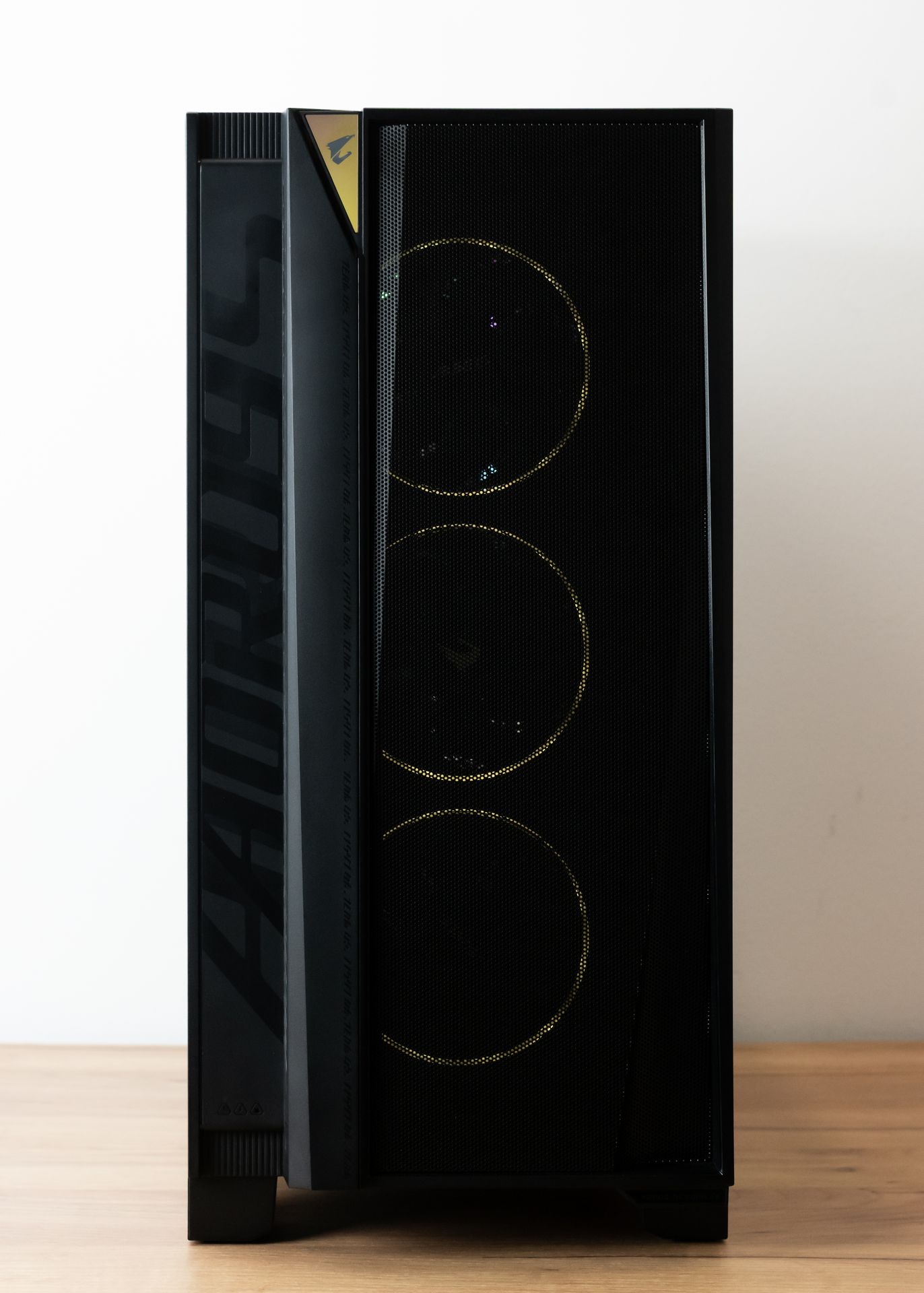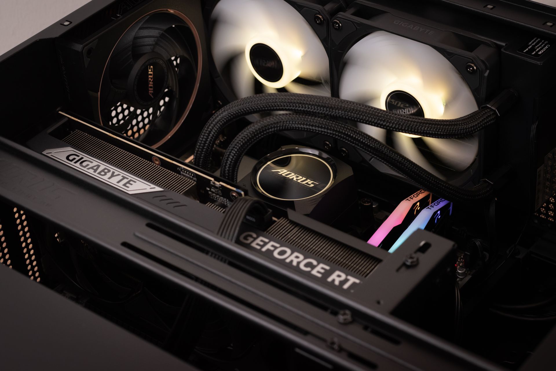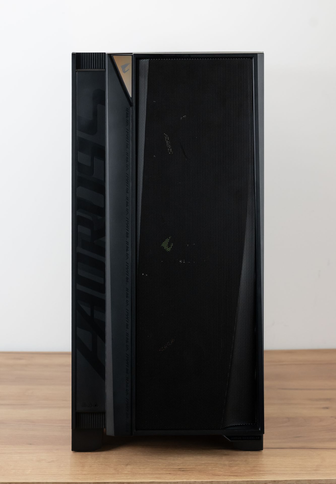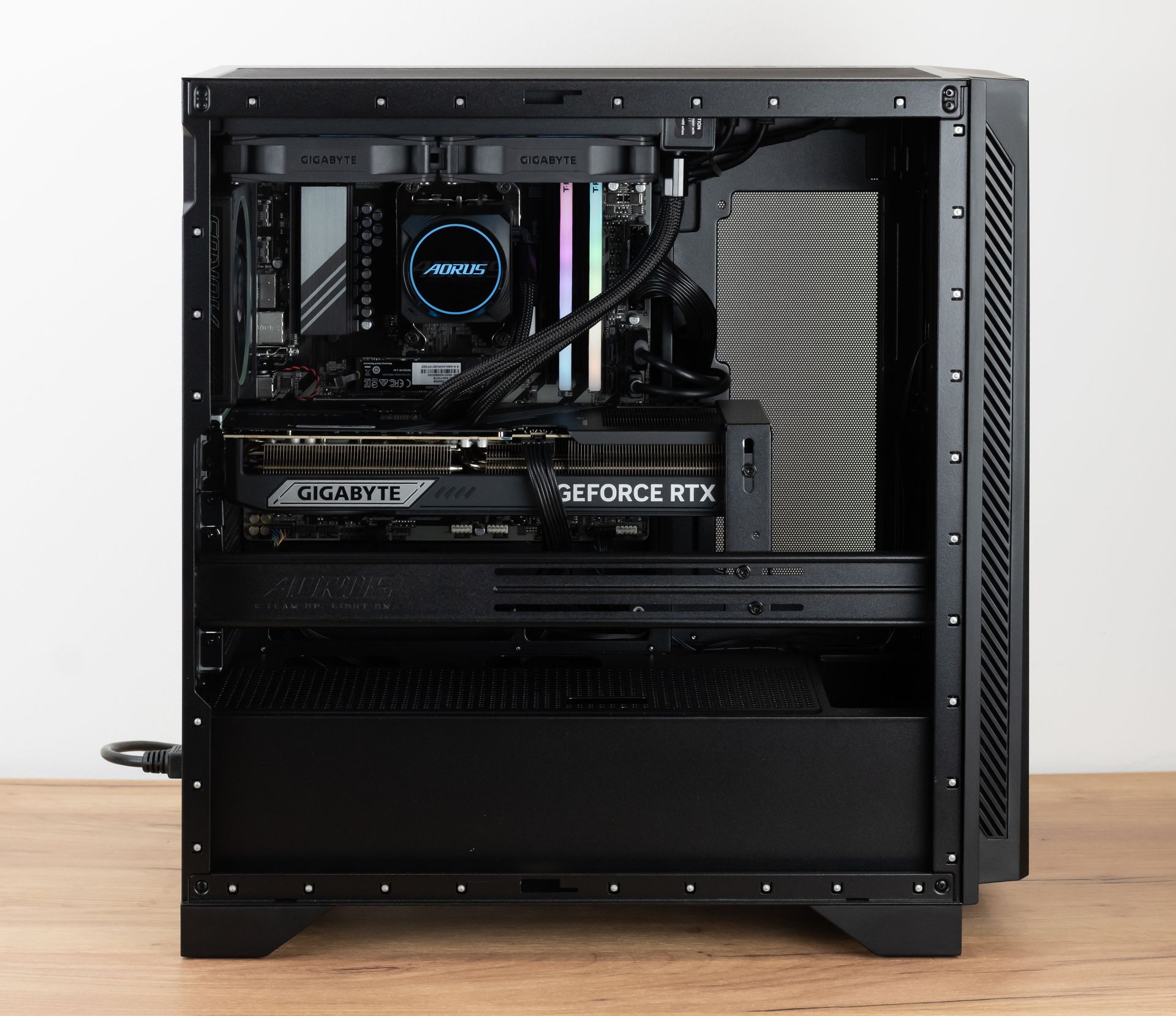 Jak już napisałem, podzespoły zamknięte są w obudowie ze szklanym panelem bocznym. O wentylację dba front typu mesh, dzięki któremu wentylatory mają swobodny dostęp do świeżego powietrza. Na przednim panelu mamy przyciski Power/Reset, wyjście słuchawkowe, wejście mikrofonu oraz dwa porty USB 3.2 Gen 1, po sztuce Type-A oraz Type-C. Za wtłaczanie świeżego powietrza do wnętrza odpowiadają trzy wentylatory 120 mm zamontowane na froncie, z obręczami z podświetleniem LED z RGB. A wyrzucaniem nagrzanego powietrza na zewnątrz zajmuje się czwarta sztuka, zainstalowana z tyłu i ponownie z takimi samymi diodami LED. Chłodzenie procesora to cooler wodny typu AIO z chłodnicą 240 mm, zamontowaną na górze. To przy tym kolejny komponent z iluminacją LED z RGB, która obejmuje wentylatory chłodnicy oraz blokopompkę. Za zasilanie odpowiada GIGABYTE UD850GM PG5 V2 o mocy 850 W, z certyfikatem 80 PLUS Gold, zgodnością ze standardem ATX 3.1 i natywnym kablem 16-pin do zasilania karty graficznej. Innymi słowy, mamy spory zapas mocy i zgodność z najnowszymi standardami.