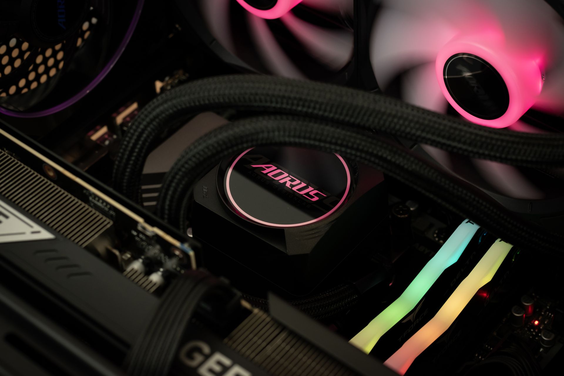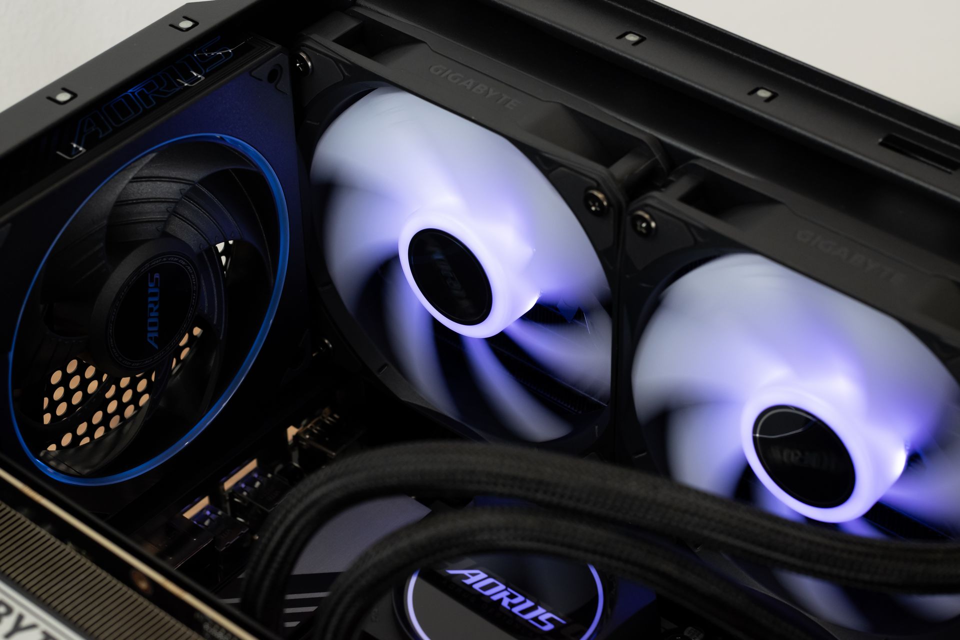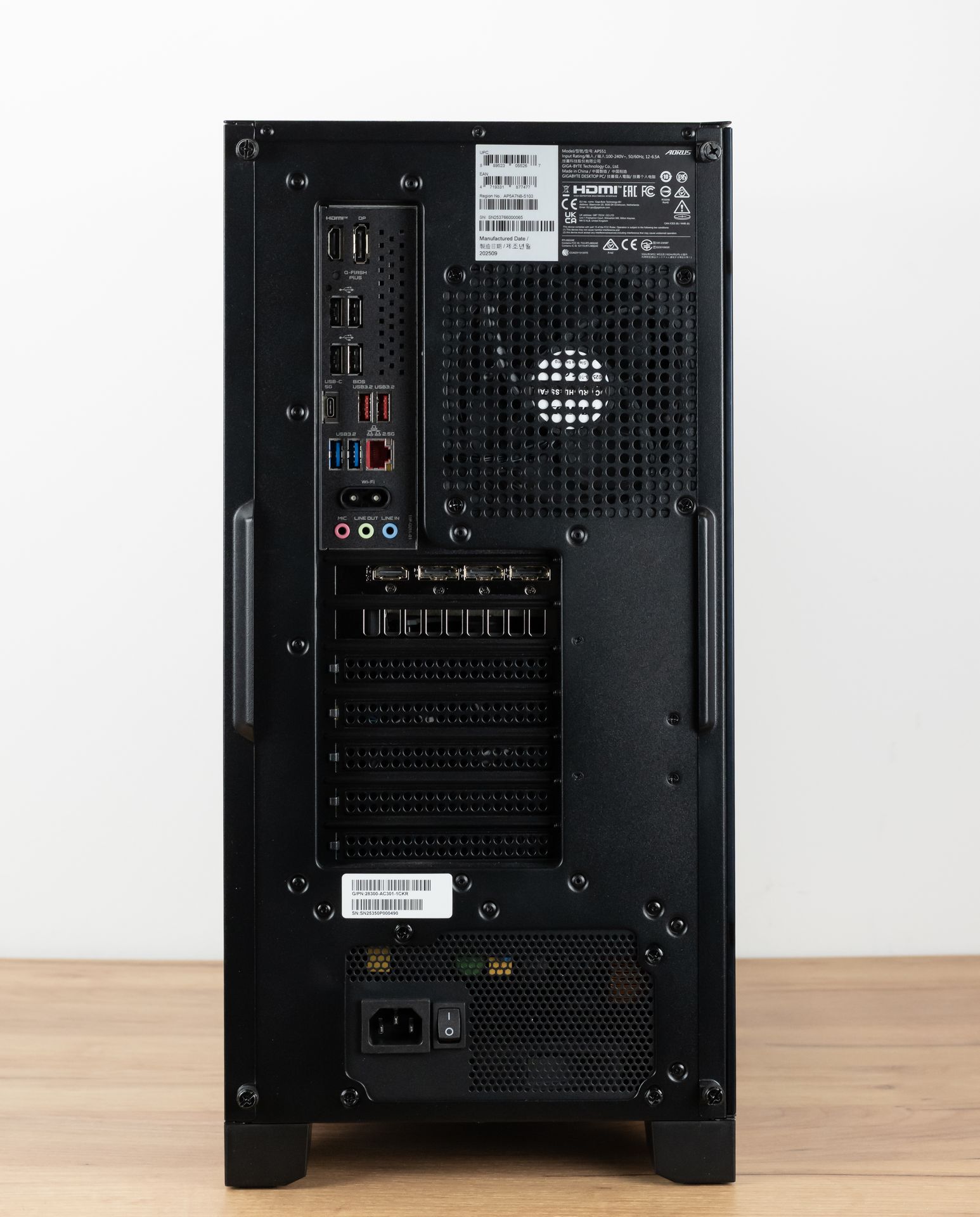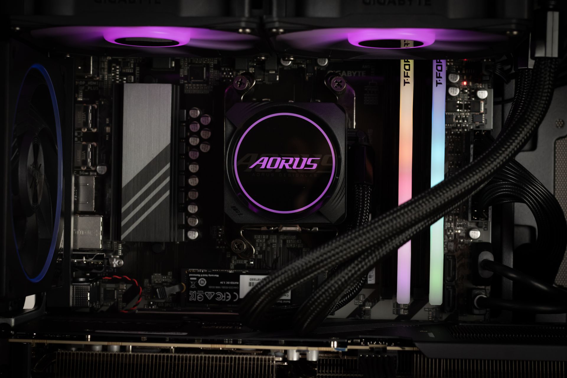 Jak już napisałem, podzespoły zamknięte są w obudowie ze szklanym panelem bocznym. O wentylację dba front typu mesh, dzięki któremu wentylatory mają swobodny dostęp do świeżego powietrza. Na przednim panelu mamy przyciski Power/Reset, wyjście słuchawkowe, wejście mikrofonu oraz dwa porty USB 3.2 Gen 1, po sztuce Type-A oraz Type-C. Za wtłaczanie świeżego powietrza do wnętrza odpowiadają trzy wentylatory 120 mm zamontowane na froncie, z obręczami z podświetleniem LED z RGB. A wyrzucaniem nagrzanego powietrza na zewnątrz zajmuje się czwarta sztuka, zainstalowana z tyłu i ponownie z takimi samymi diodami LED. Chłodzenie procesora to cooler wodny typu AIO z chłodnicą 240 mm, zamontowaną na górze. To przy tym kolejny komponent z iluminacją LED z RGB, która obejmuje wentylatory chłodnicy oraz blokopompkę. Za zasilanie odpowiada GIGABYTE UD850GM PG5 V2 o mocy 850 W, z certyfikatem 80 PLUS Gold, zgodnością ze standardem ATX 3.1 i natywnym kablem 16-pin do zasilania karty graficznej. Innymi słowy, mamy spory zapas mocy i zgodność z najnowszymi standardami.