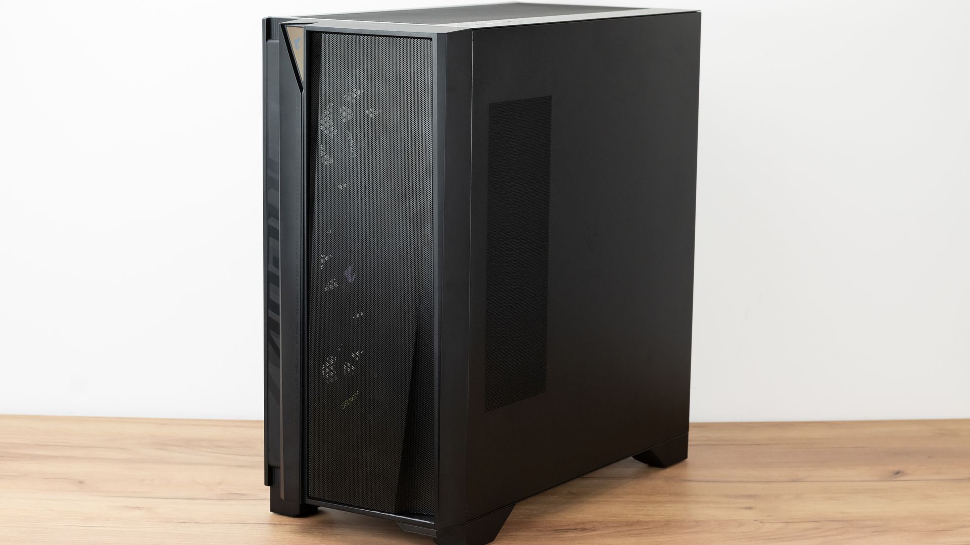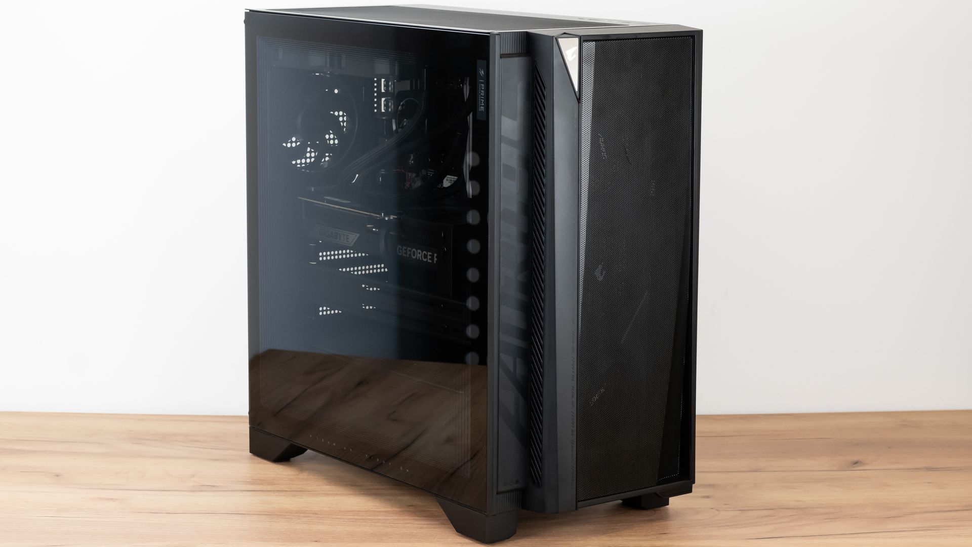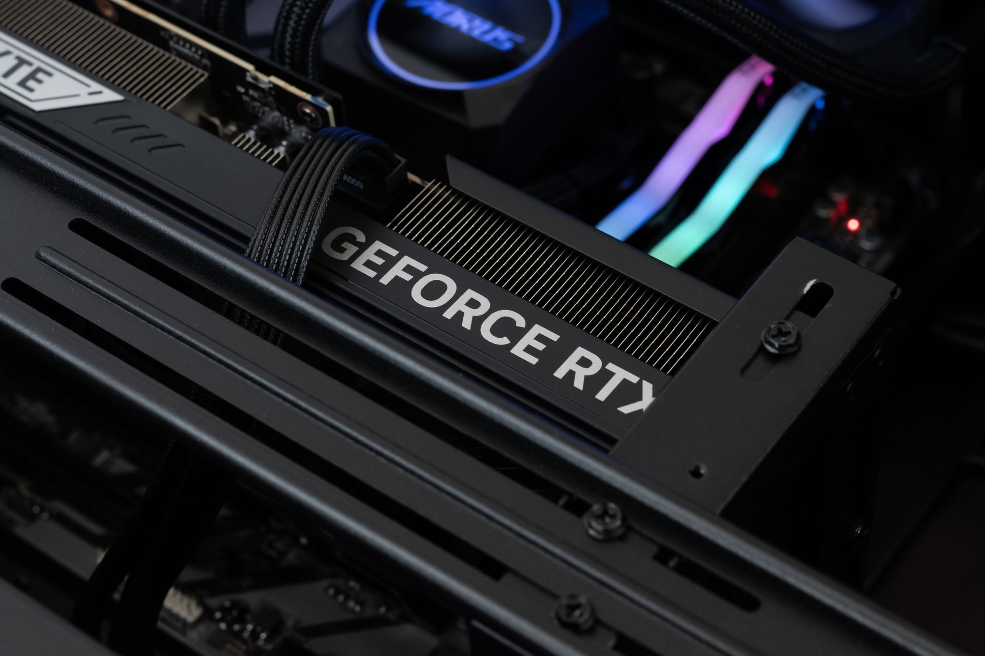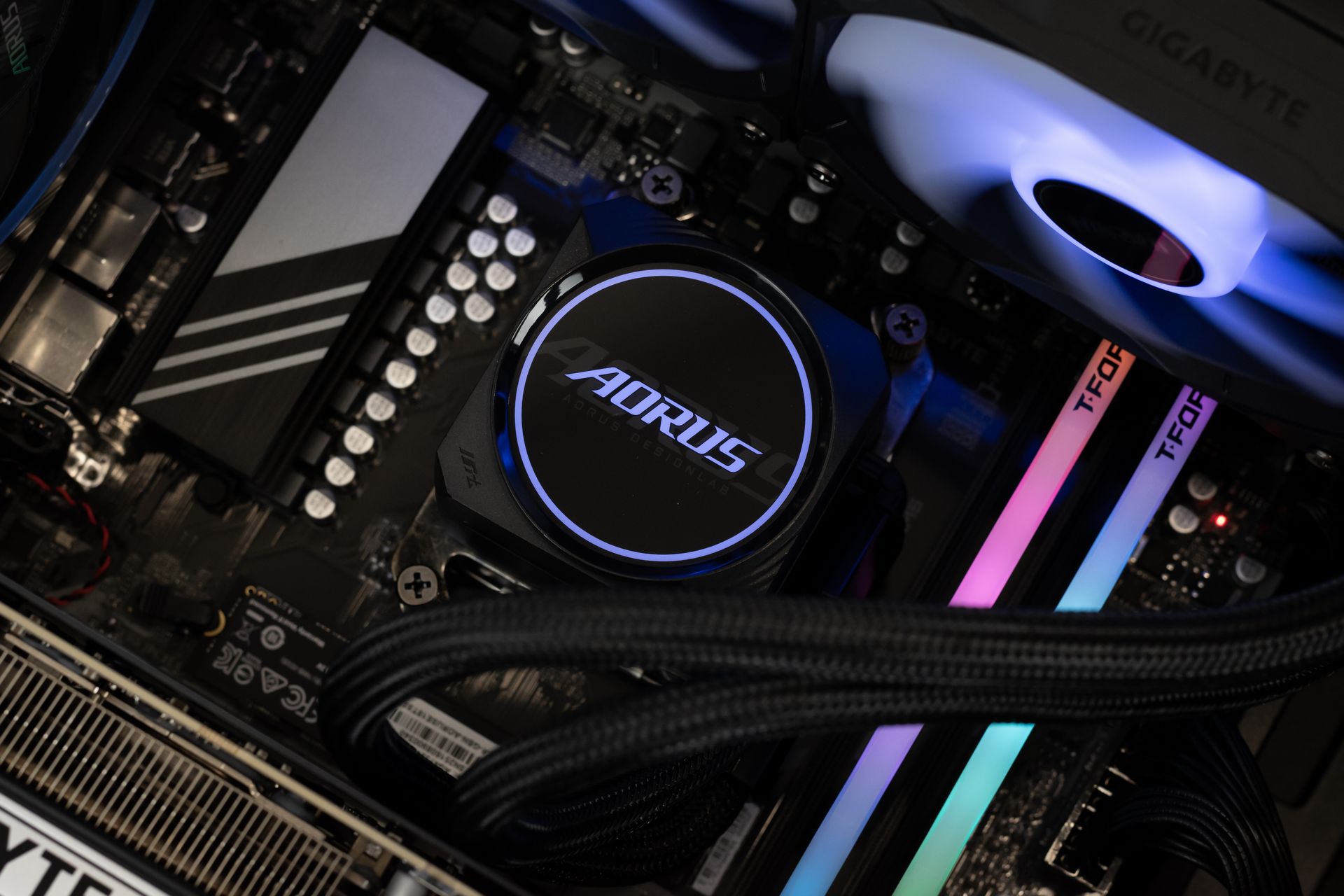 Jak już napisałem, podzespoły zamknięte są w obudowie ze szklanym panelem bocznym. O wentylację dba front typu mesh, dzięki któremu wentylatory mają swobodny dostęp do świeżego powietrza. Na przednim panelu mamy przyciski Power/Reset, wyjście słuchawkowe, wejście mikrofonu oraz dwa porty USB 3.2 Gen 1, po sztuce Type-A oraz Type-C. Za wtłaczanie świeżego powietrza do wnętrza odpowiadają trzy wentylatory 120 mm zamontowane na froncie, z obręczami z podświetleniem LED z RGB. A wyrzucaniem nagrzanego powietrza na zewnątrz zajmuje się czwarta sztuka, zainstalowana z tyłu i ponownie z takimi samymi diodami LED. Chłodzenie procesora to cooler wodny typu AIO z chłodnicą 240 mm, zamontowaną na górze. To przy tym kolejny komponent z iluminacją LED z RGB, która obejmuje wentylatory chłodnicy oraz blokopompkę. Za zasilanie odpowiada GIGABYTE UD850GM PG5 V2 o mocy 850 W, z certyfikatem 80 PLUS Gold, zgodnością ze standardem ATX 3.1 i natywnym kablem 16-pin do zasilania karty graficznej. Innymi słowy, mamy spory zapas mocy i zgodność z najnowszymi standardami.