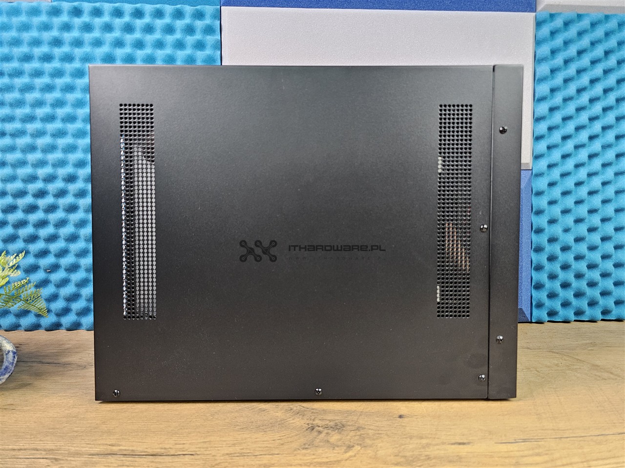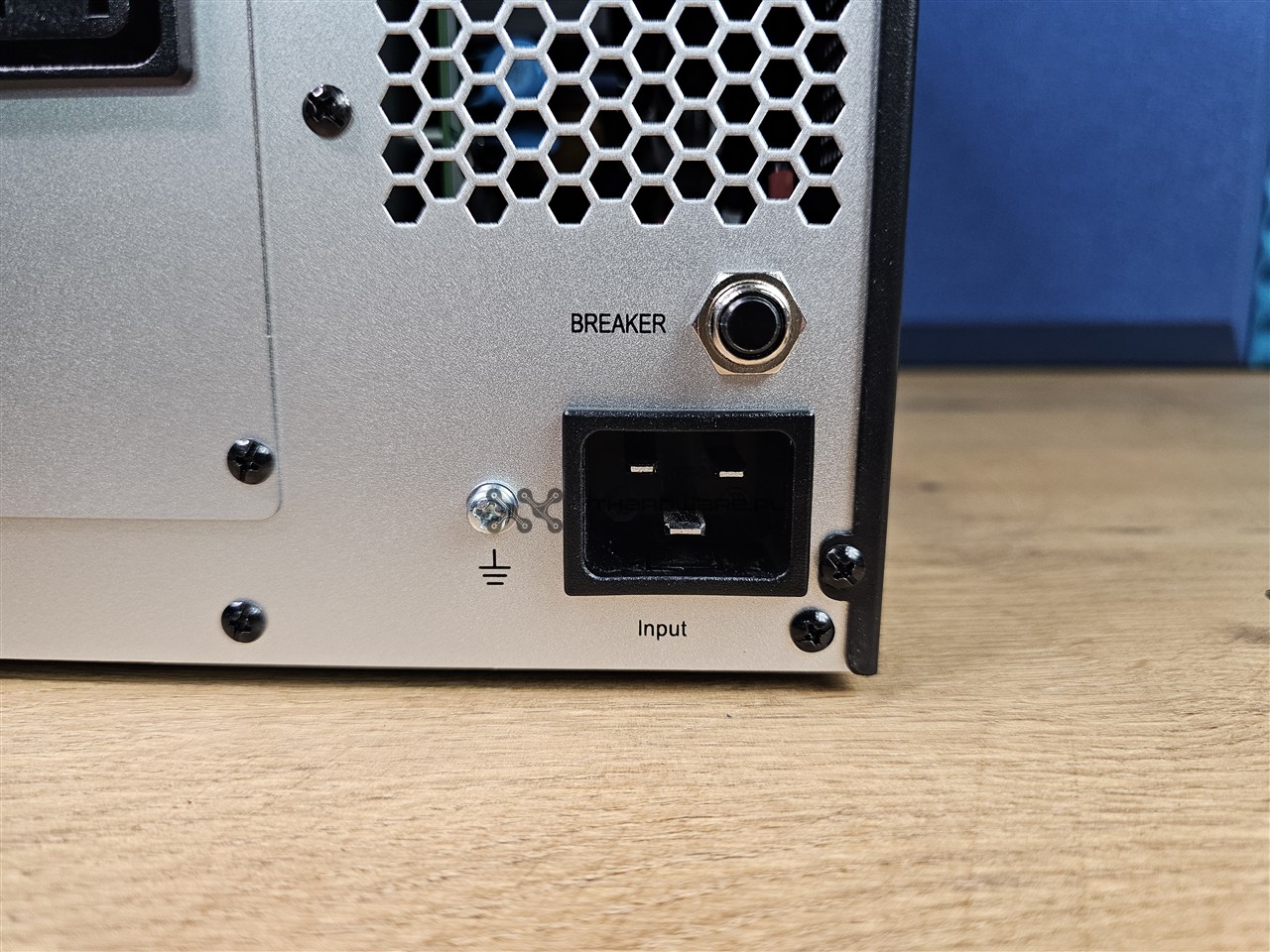Powyżej umieszczono monochromatyczny wyświetlacz LCD podświetlany na biało, informujący o parametrach pracy i stanie baterii, a pod nim trzy przyciski do obsługi menu, nad ekranem mamy cztery diody LED sygnalizujące tryb pracy zasilacza lub błąd. Boczne panele mają dodatkowe perforacje wentylacyjne, a po ich zdjęciu uzyskujemy dostęp do akumulatorów VRLA.