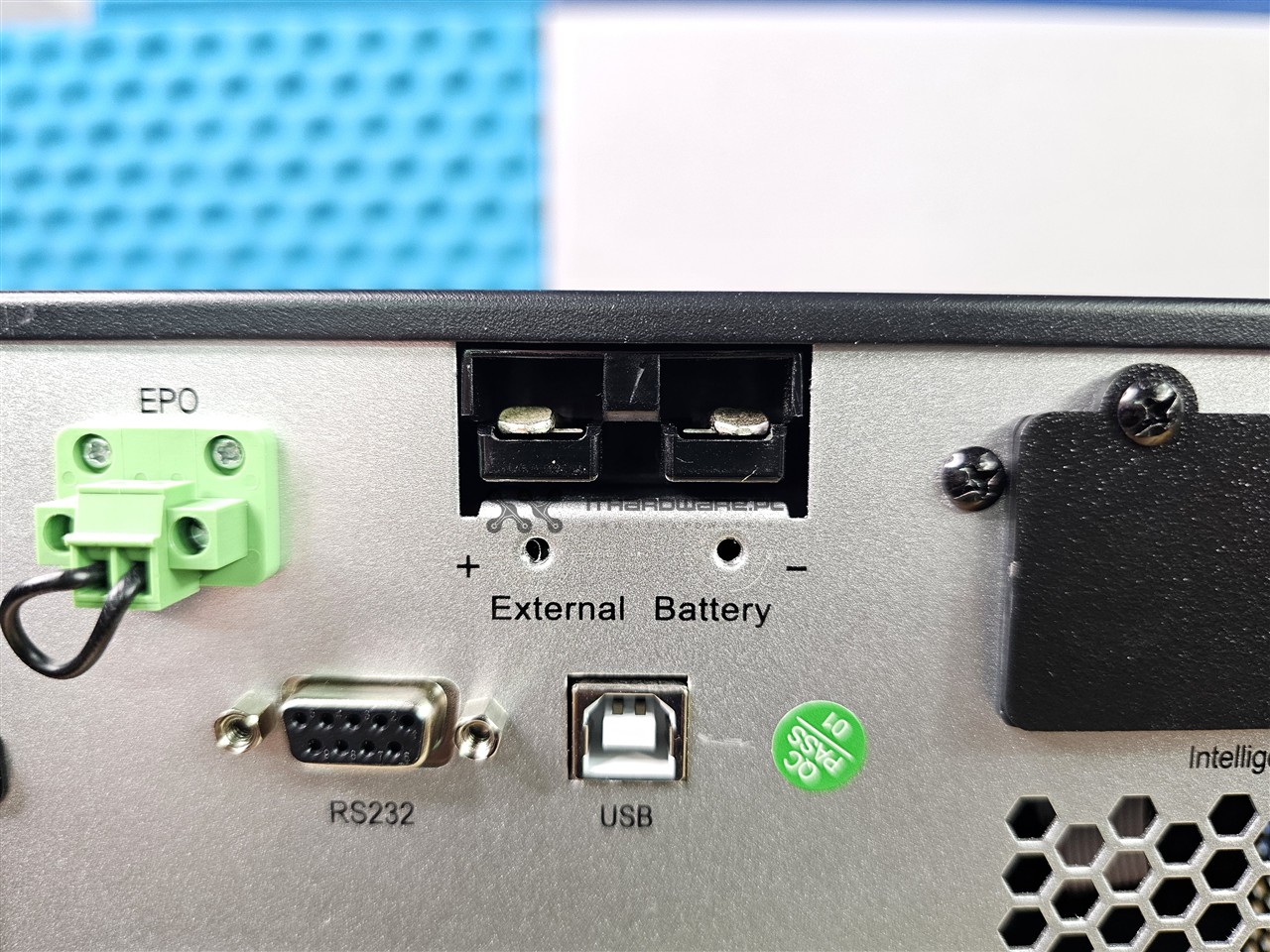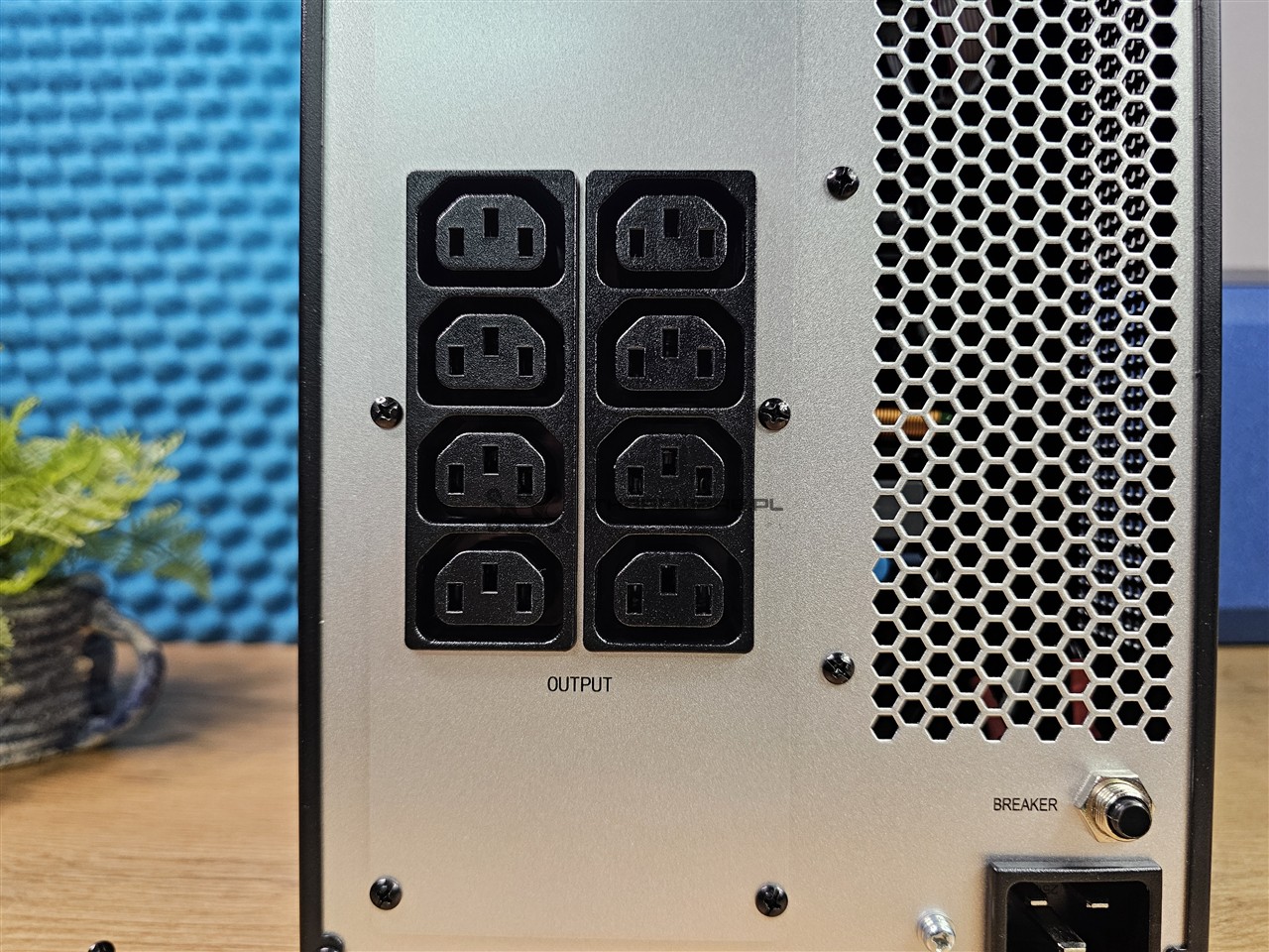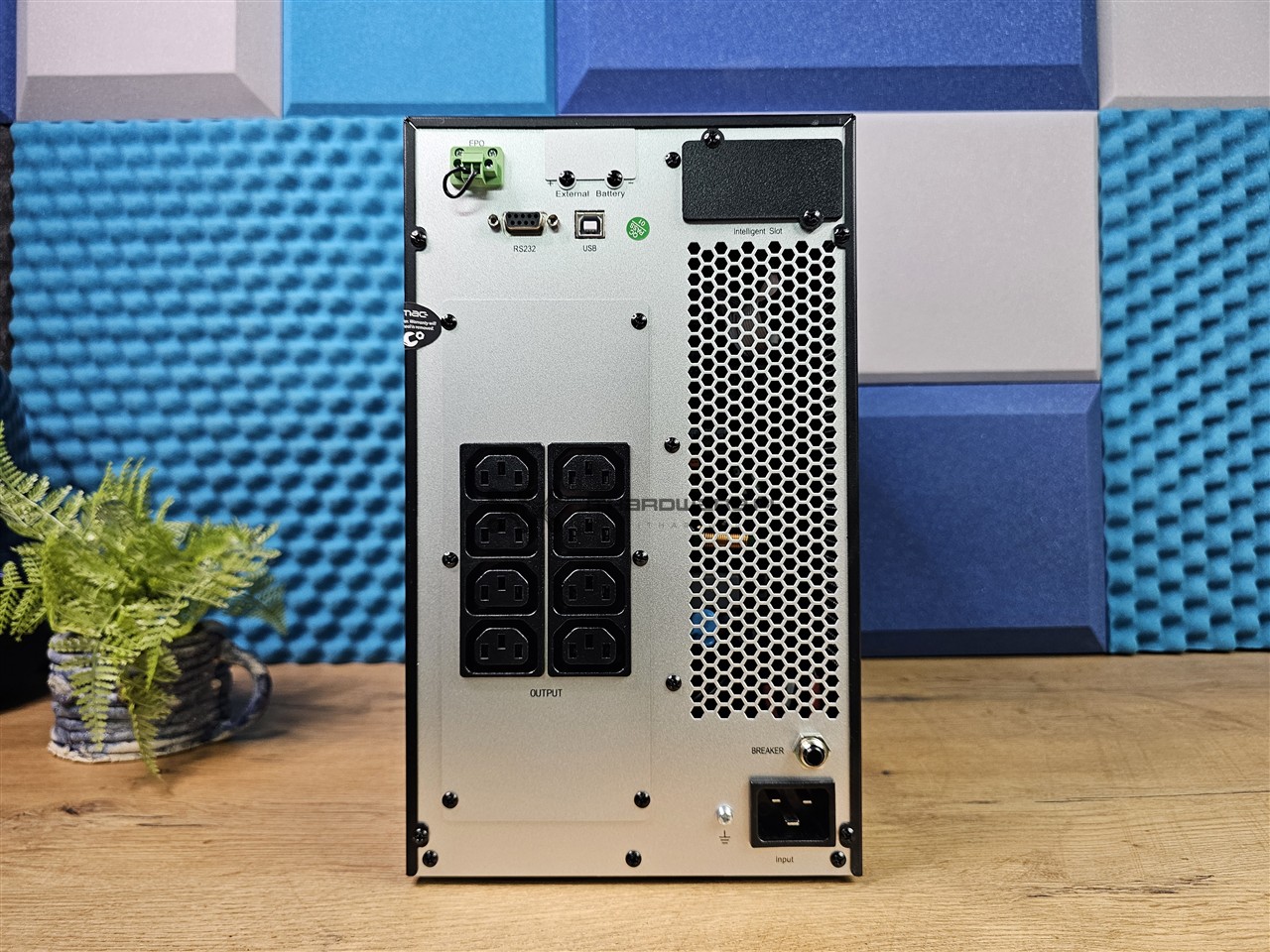 Na tylnym panelu producent przewidział osiem wyjść IEC 320 C13 oraz wejście zasilania IEC 320 C20 zabezpieczone automatycznym bezpiecznikiem. Nad gniazdami znajdują się dwie kratki wentylacyjne chłodzenia elektroniki zasilacza. W górnej części panelu ulokowano porty USB i RS232, a także złącze awaryjnego wyłącznika EPO. Obok znalazł się terminal do podłączenia zewnętrznego pakietu baterii oraz slot rozszerzeń (Intelligent Slot) – umożliwiający instalację dodatkowych kart, np. SNMP do monitorowania przez sieć.