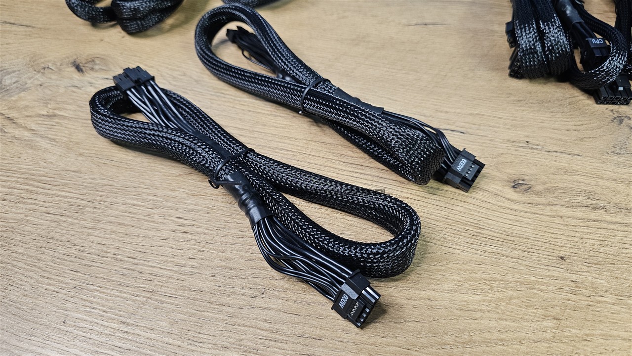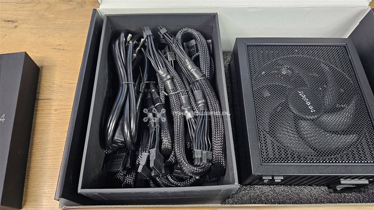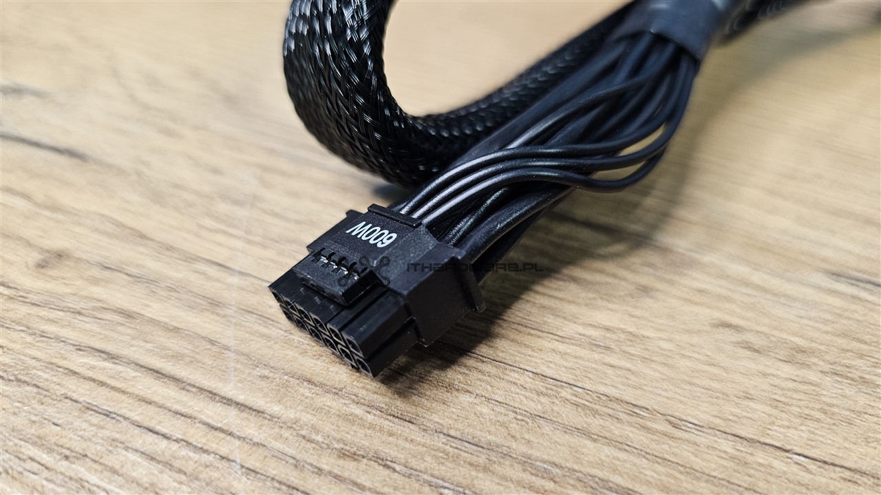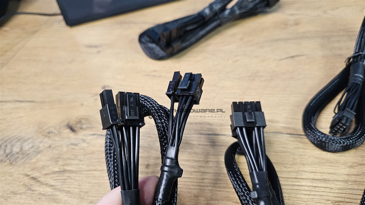 Do dyspozycji mamy kompletny zestaw przewodów, w tym dwa natywne kable PCIe 5.1 12V-2×6 oraz cztery klasyczne wiązki PCI-E (6+2)-pin. Nośniki danych i akcesoria zasilimy trzema wiązkami SATA oraz jedną wiązką mieszaną SATA/Molex. Długości przewodów są wystarczające nawet do dużych obudów typu full tower. W przypadku przewodów PCI-E zastosowano jednolity przekrój 18 AWG, natomiast w kablach PCIe 5.1 producent wykorzystał mieszankę żył 16–24 AWG, zgodnie z wymaganiami standardu ATX 3.1.