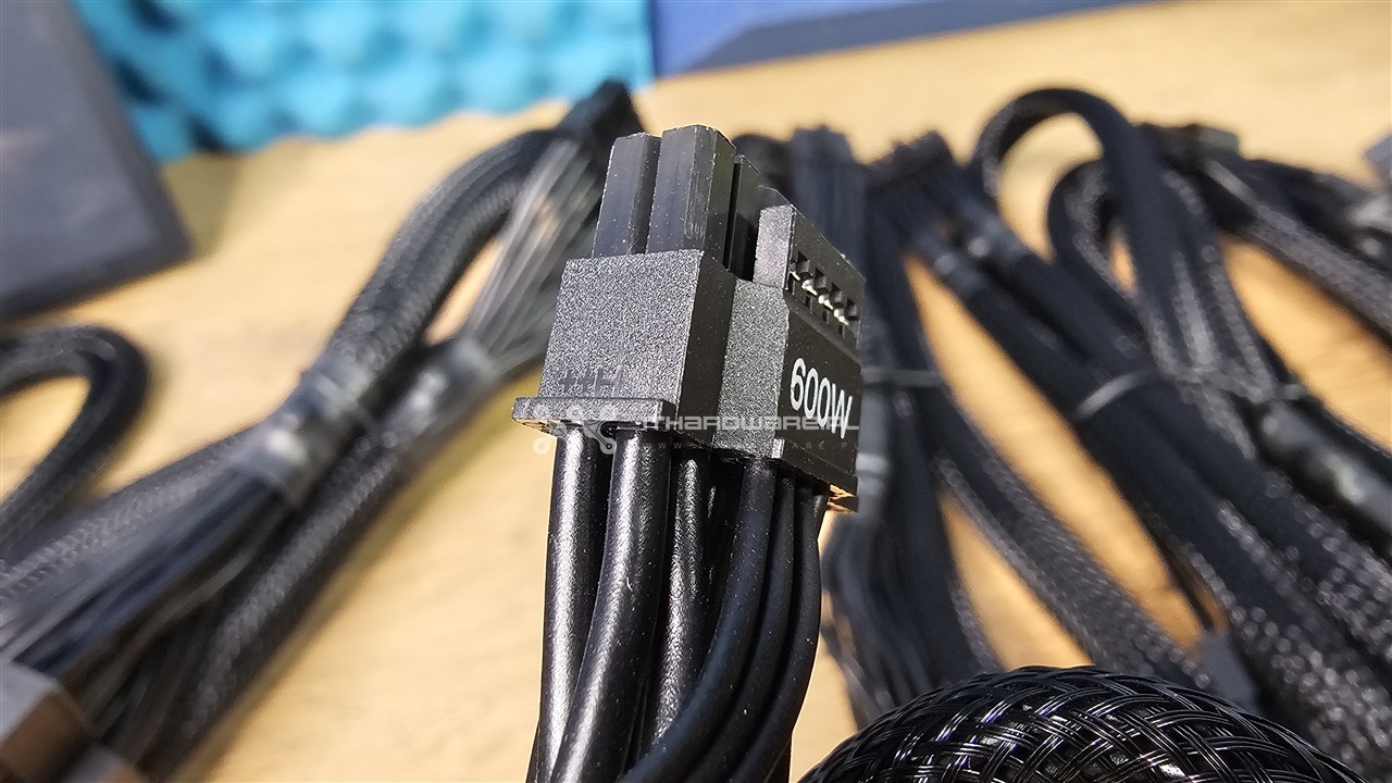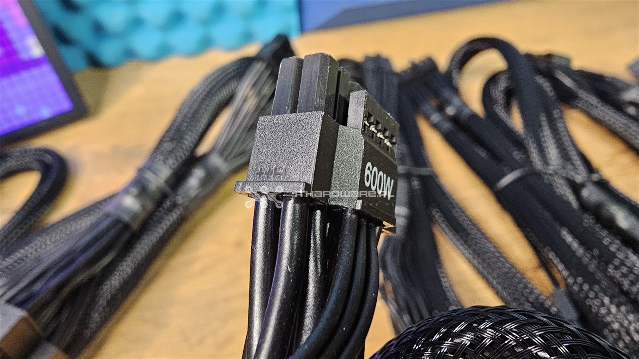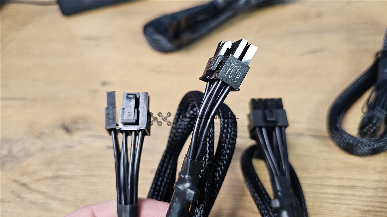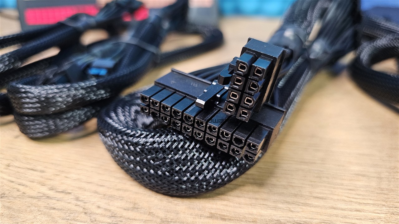Do dyspozycji mamy kompletny zestaw przewodów, w tym dwa natywne kable PCIe 5.1 12V-2×6 oraz cztery klasyczne wiązki PCI-E (6+2)-pin. Nośniki danych i akcesoria zasilimy trzema wiązkami SATA oraz jedną wiązką mieszaną SATA/Molex. Długości przewodów są wystarczające nawet do dużych obudów typu full tower. W przypadku przewodów PCI-E zastosowano jednolity przekrój 18 AWG, natomiast w kablach PCIe 5.1 producent wykorzystał mieszankę żył 16–24 AWG, zgodnie z wymaganiami standardu ATX 3.1.