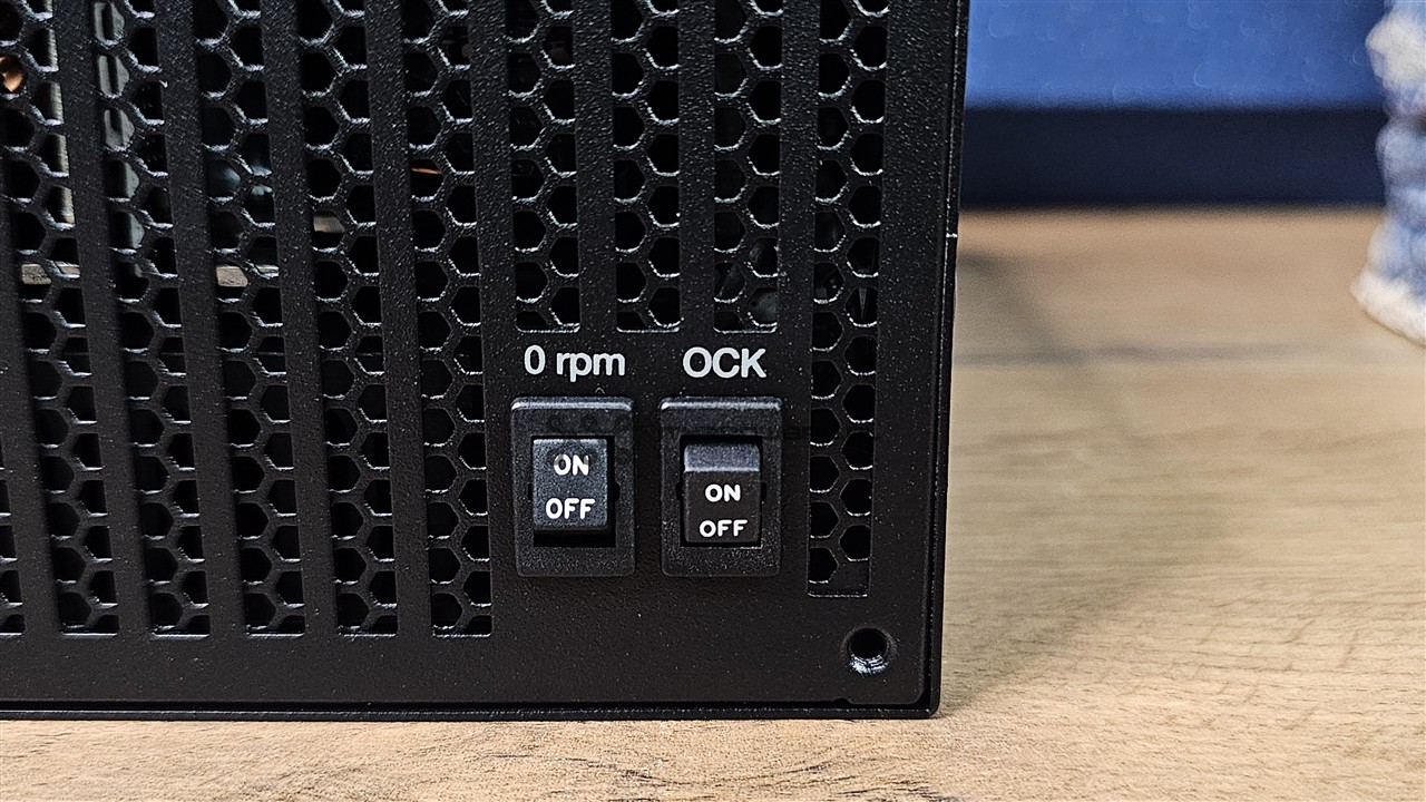 Tył zasilacza wykonano z perforowanej blachy w kształcie plastra miodu, którą osłania dodatkowa blacha z pionowymi wycięciami. Znajdziemy tutaj włącznik oraz gniazdo zasilania w standardzie IEC320 C14, a także dwa dedykowane przełączniki 0 RPM, umożliwiający aktywację półpasywnej pracy układu chłodzenia, oraz przełącznik OCK, pozwalający na połączenie kilku linii +12 V w jedną wspólną szynę (tryb single-rail).