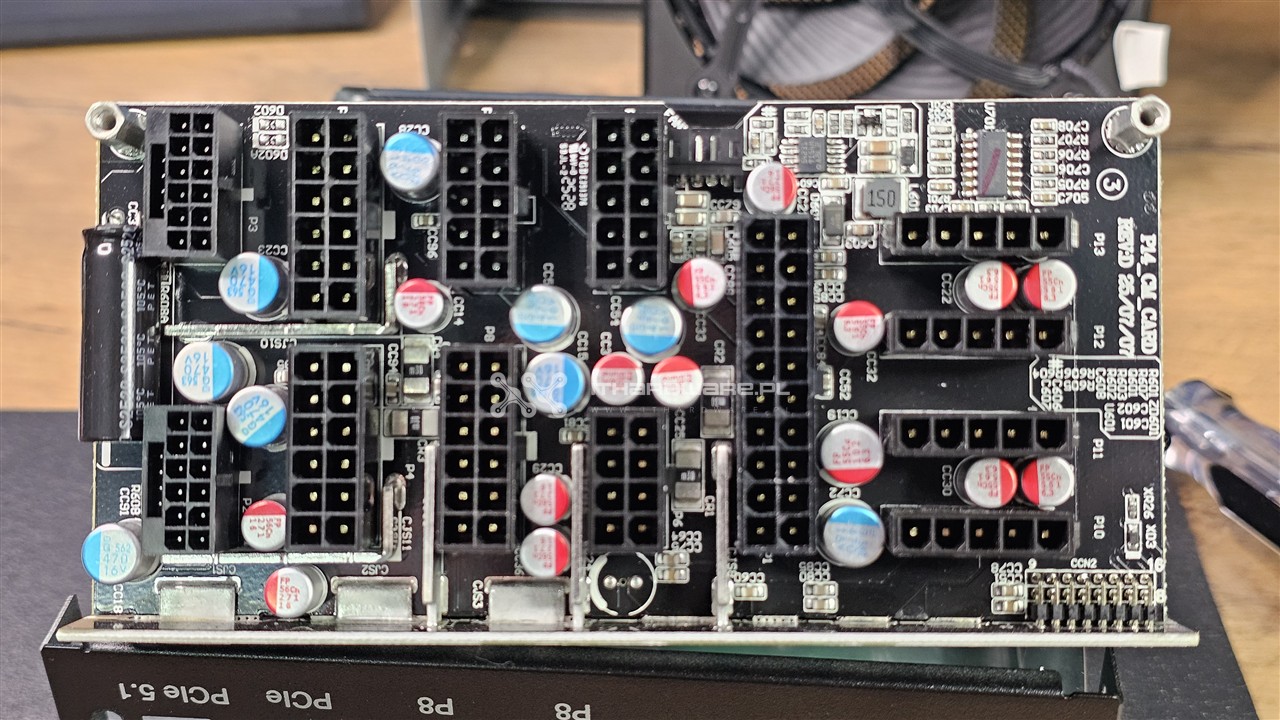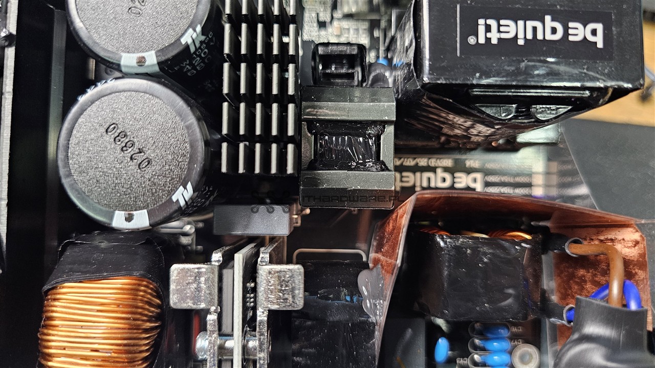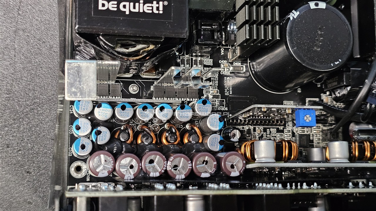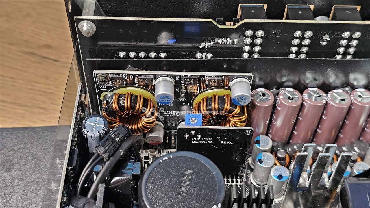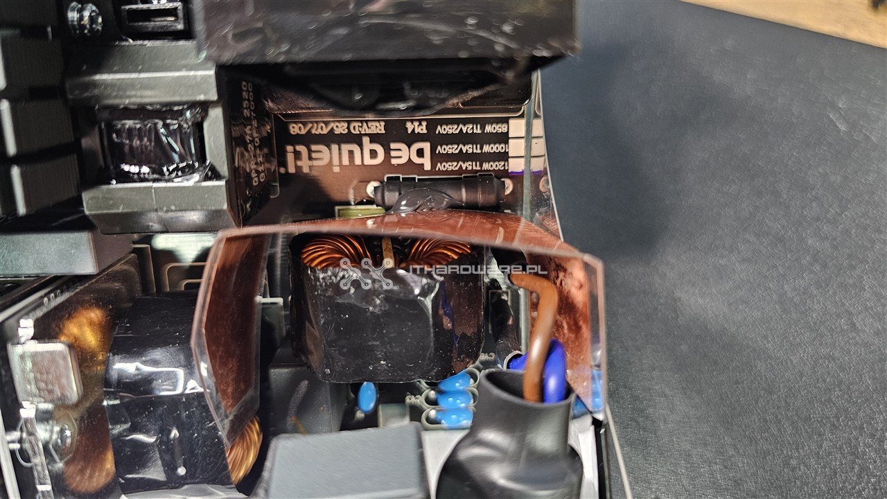 W lewej części wnętrza be quiet! Dark Power 14 znajduje się rozbudowany filtr EMI oraz elementy wejściowe sekcji APFC, wraz z cewką i radiatorami sekcji pierwotnej. W centralnej części PCB umieszczono sekcję kluczowania pracującą w topologii pełnego mostu, a także układ 5 Vsb, którego niewielki transformator jest łatwo rozpoznawalny w środkowej strefie płyty głównej. Główny transformator zasilacza zlokalizowano przy dolnej krawędzi PCB, tuż za sekcją kluczowania. Po stronie wtórnej, na pionowym laminacie, znajduje się synchroniczny prostownik linii +12 V, a bezpośrednio obok rozmieszczono baterię kondensatorów elektrolitycznych i aluminiowo-polimerowych. Kolejny pionowy laminat odpowiada za przetwornice DC-DC generujące linie +5 V i +3,3 V. Przy samej krawędzi obudowy umieszczono PCB z gniazdami modularnego okablowania.