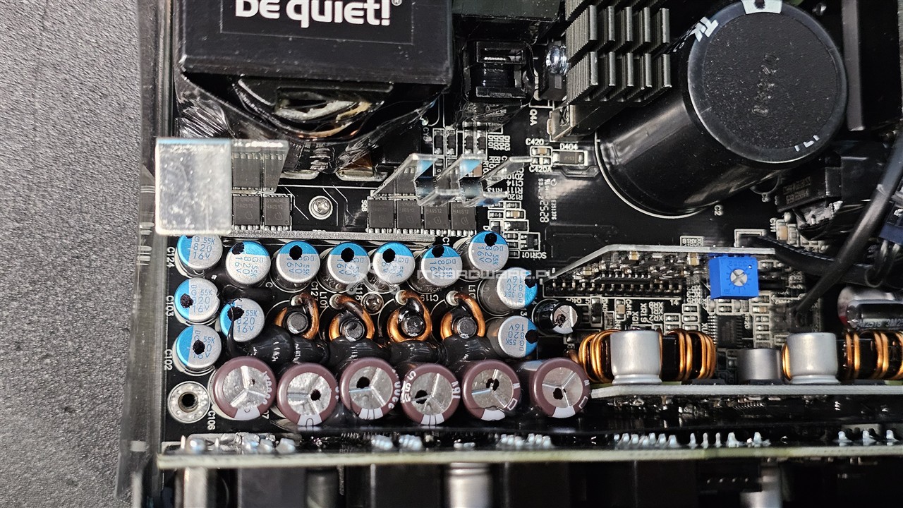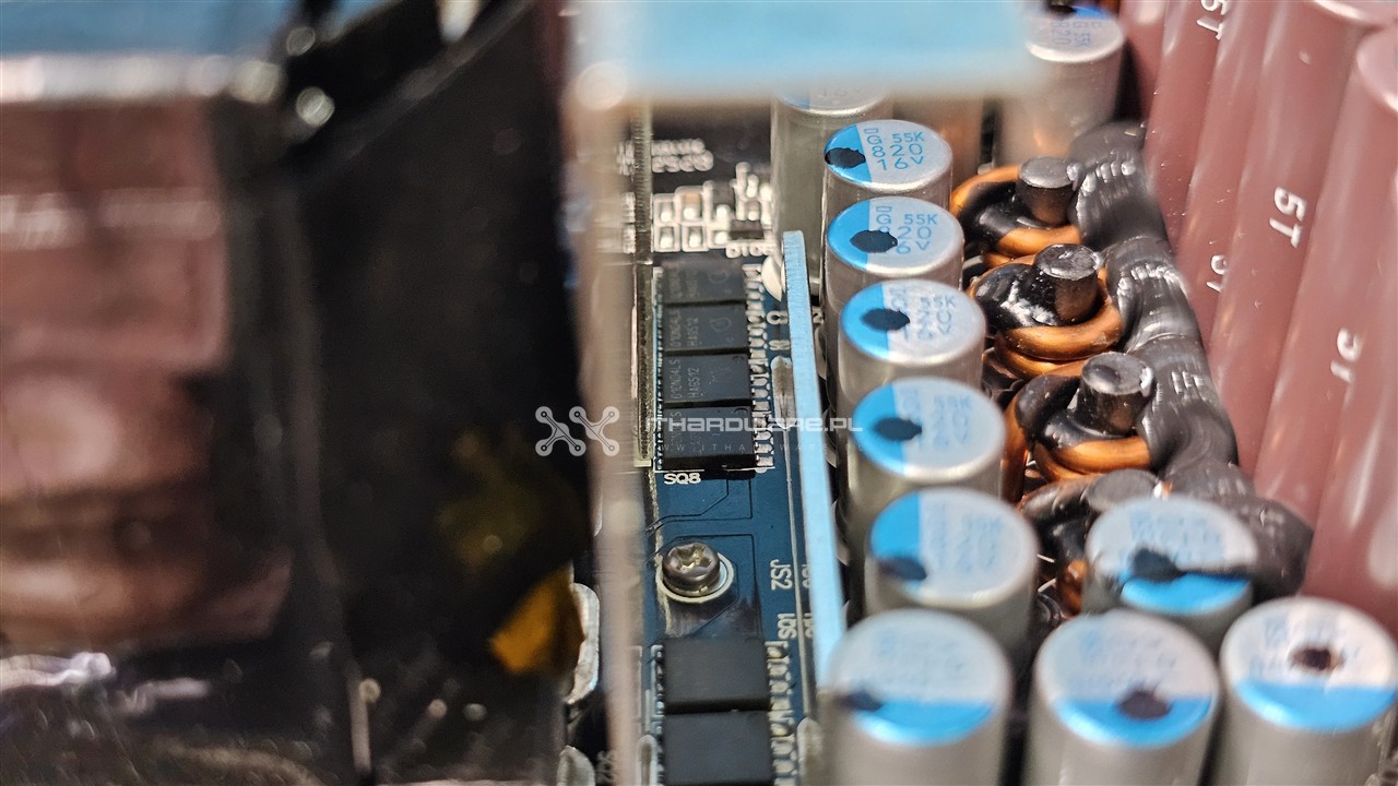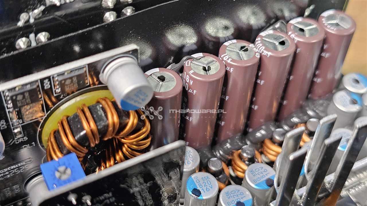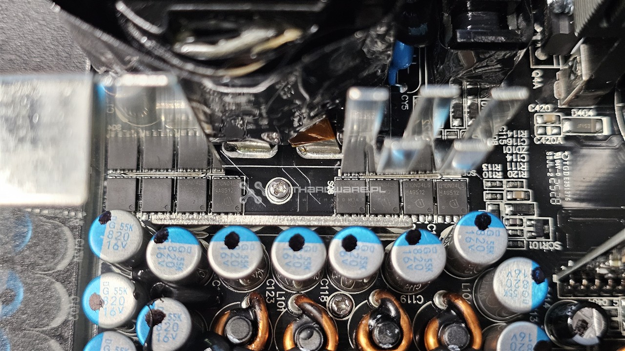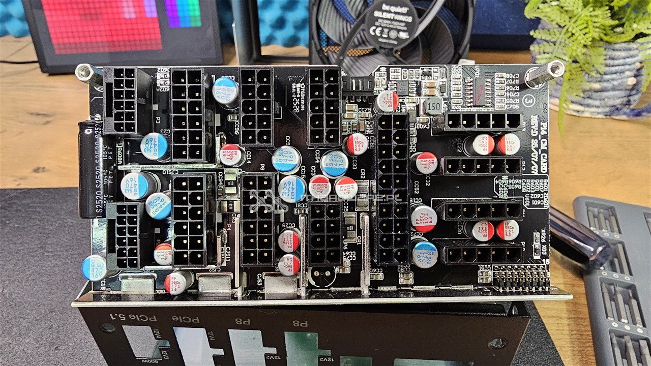 W lewej części wnętrza be quiet! Dark Power 14 znajduje się rozbudowany filtr EMI oraz elementy wejściowe sekcji APFC, wraz z cewką i radiatorami sekcji pierwotnej. W centralnej części PCB umieszczono sekcję kluczowania pracującą w topologii pełnego mostu, a także układ 5 Vsb, którego niewielki transformator jest łatwo rozpoznawalny w środkowej strefie płyty głównej. Główny transformator zasilacza zlokalizowano przy dolnej krawędzi PCB, tuż za sekcją kluczowania. Po stronie wtórnej, na pionowym laminacie, znajduje się synchroniczny prostownik linii +12 V, a bezpośrednio obok rozmieszczono baterię kondensatorów elektrolitycznych i aluminiowo-polimerowych. Kolejny pionowy laminat odpowiada za przetwornice DC-DC generujące linie +5 V i +3,3 V. Przy samej krawędzi obudowy umieszczono PCB z gniazdami modularnego okablowania.