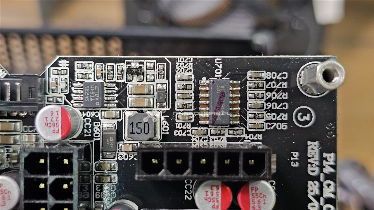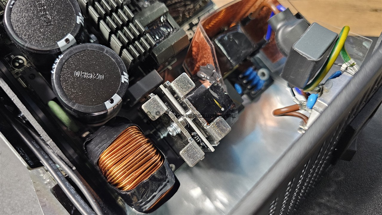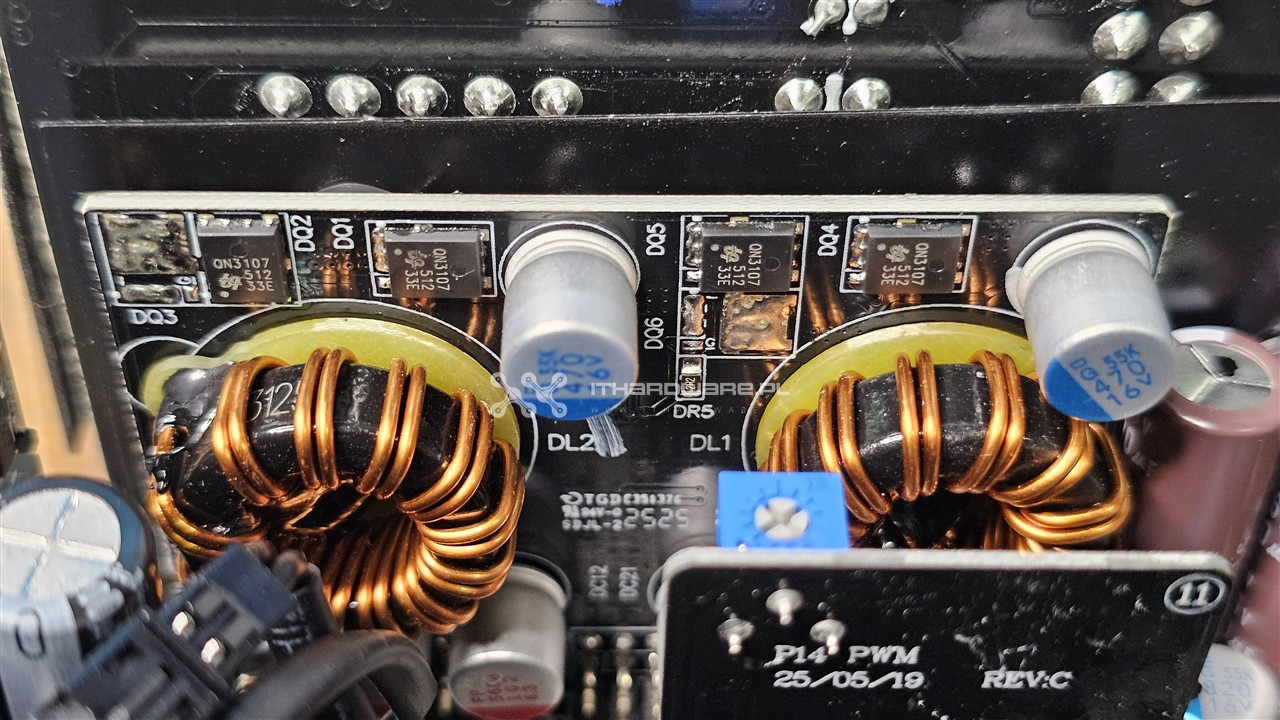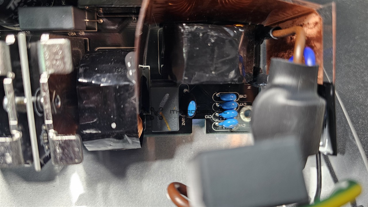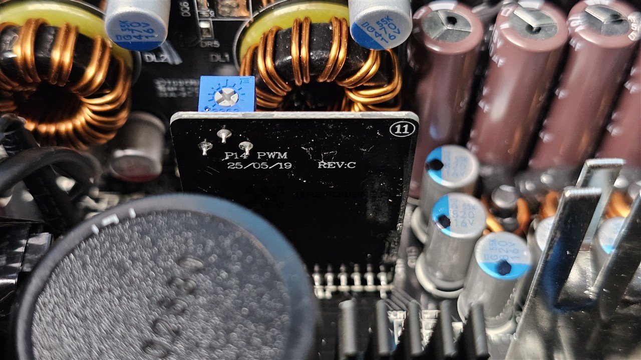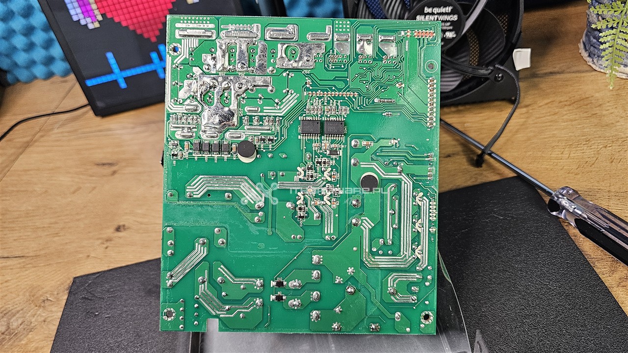 W lewej części wnętrza be quiet! Dark Power 14 znajduje się rozbudowany filtr EMI oraz elementy wejściowe sekcji APFC, wraz z cewką i radiatorami sekcji pierwotnej. W centralnej części PCB umieszczono sekcję kluczowania pracującą w topologii pełnego mostu, a także układ 5 Vsb, którego niewielki transformator jest łatwo rozpoznawalny w środkowej strefie płyty głównej. Główny transformator zasilacza zlokalizowano przy dolnej krawędzi PCB, tuż za sekcją kluczowania. Po stronie wtórnej, na pionowym laminacie, znajduje się synchroniczny prostownik linii +12 V, a bezpośrednio obok rozmieszczono baterię kondensatorów elektrolitycznych i aluminiowo-polimerowych. Kolejny pionowy laminat odpowiada za przetwornice DC-DC generujące linie +5 V i +3,3 V. Przy samej krawędzi obudowy umieszczono PCB z gniazdami modularnego okablowania.