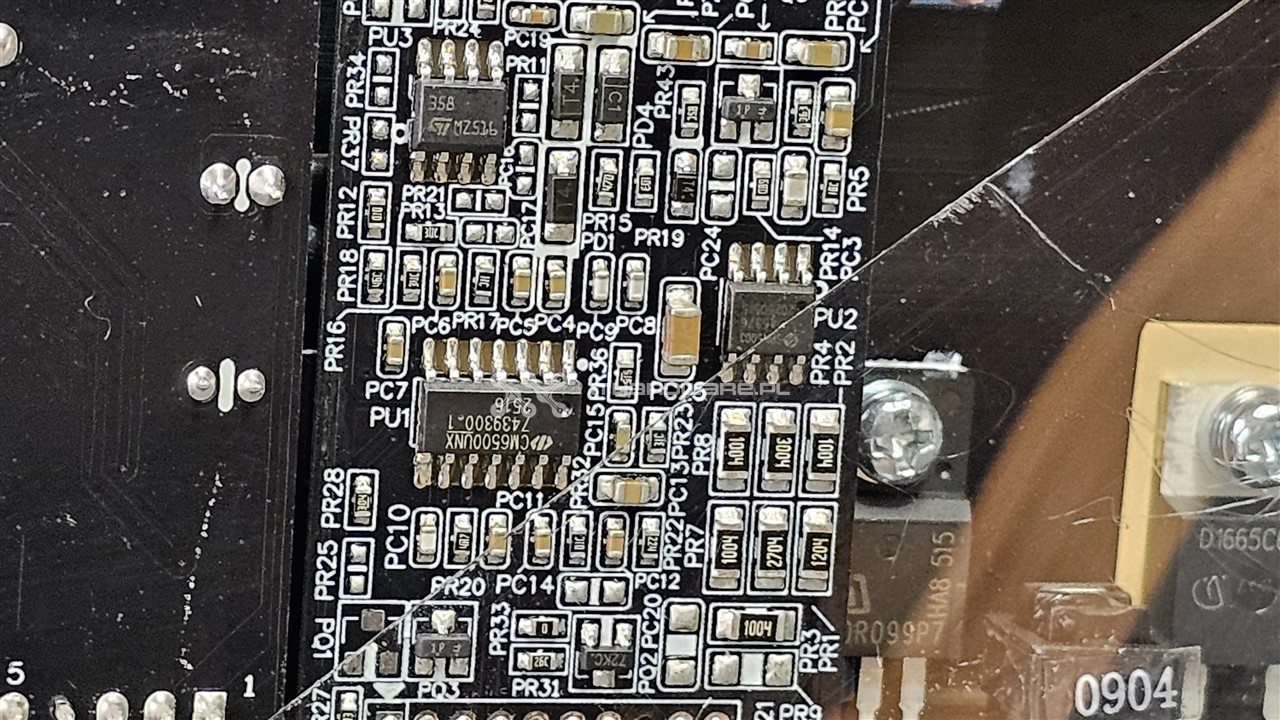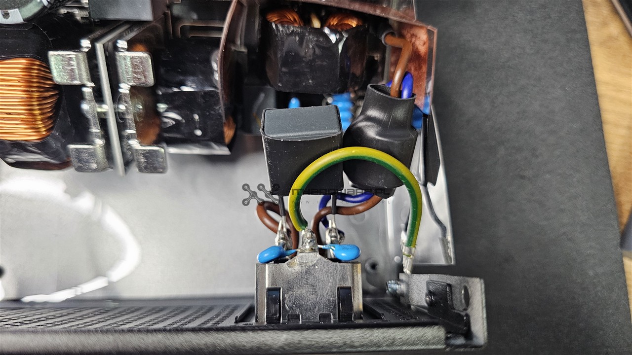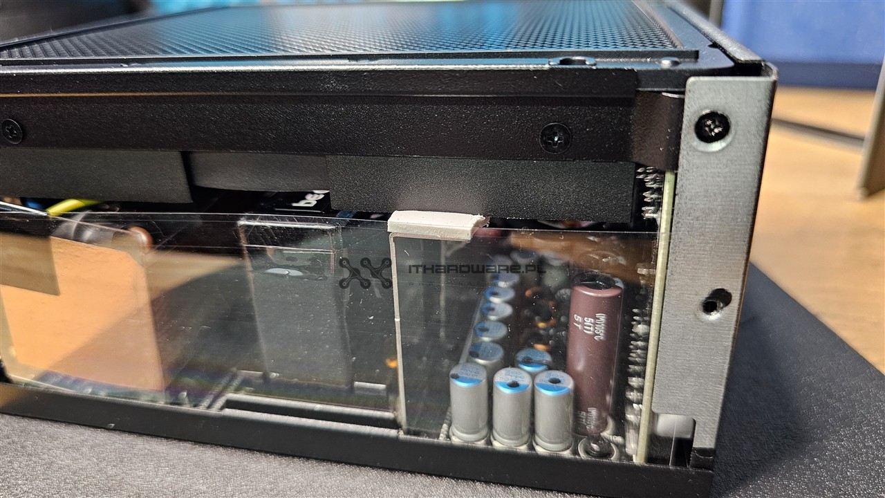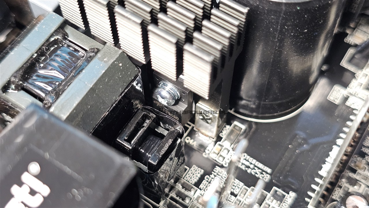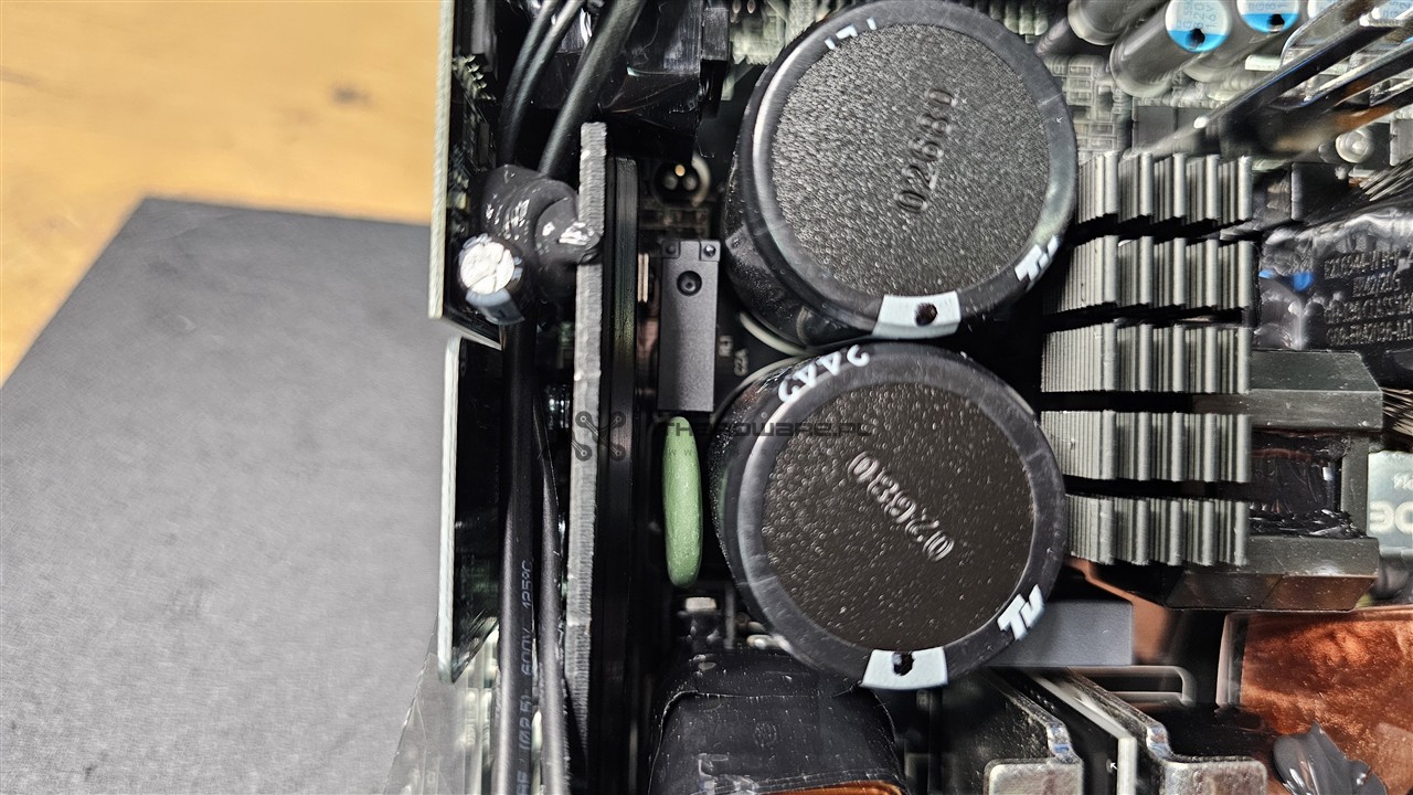 W lewej części wnętrza be quiet! Dark Power 14 znajduje się rozbudowany filtr EMI oraz elementy wejściowe sekcji APFC, wraz z cewką i radiatorami sekcji pierwotnej. W centralnej części PCB umieszczono sekcję kluczowania pracującą w topologii pełnego mostu, a także układ 5 Vsb, którego niewielki transformator jest łatwo rozpoznawalny w środkowej strefie płyty głównej. Główny transformator zasilacza zlokalizowano przy dolnej krawędzi PCB, tuż za sekcją kluczowania. Po stronie wtórnej, na pionowym laminacie, znajduje się synchroniczny prostownik linii +12 V, a bezpośrednio obok rozmieszczono baterię kondensatorów elektrolitycznych i aluminiowo-polimerowych. Kolejny pionowy laminat odpowiada za przetwornice DC-DC generujące linie +5 V i +3,3 V. Przy samej krawędzi obudowy umieszczono PCB z gniazdami modularnego okablowania.