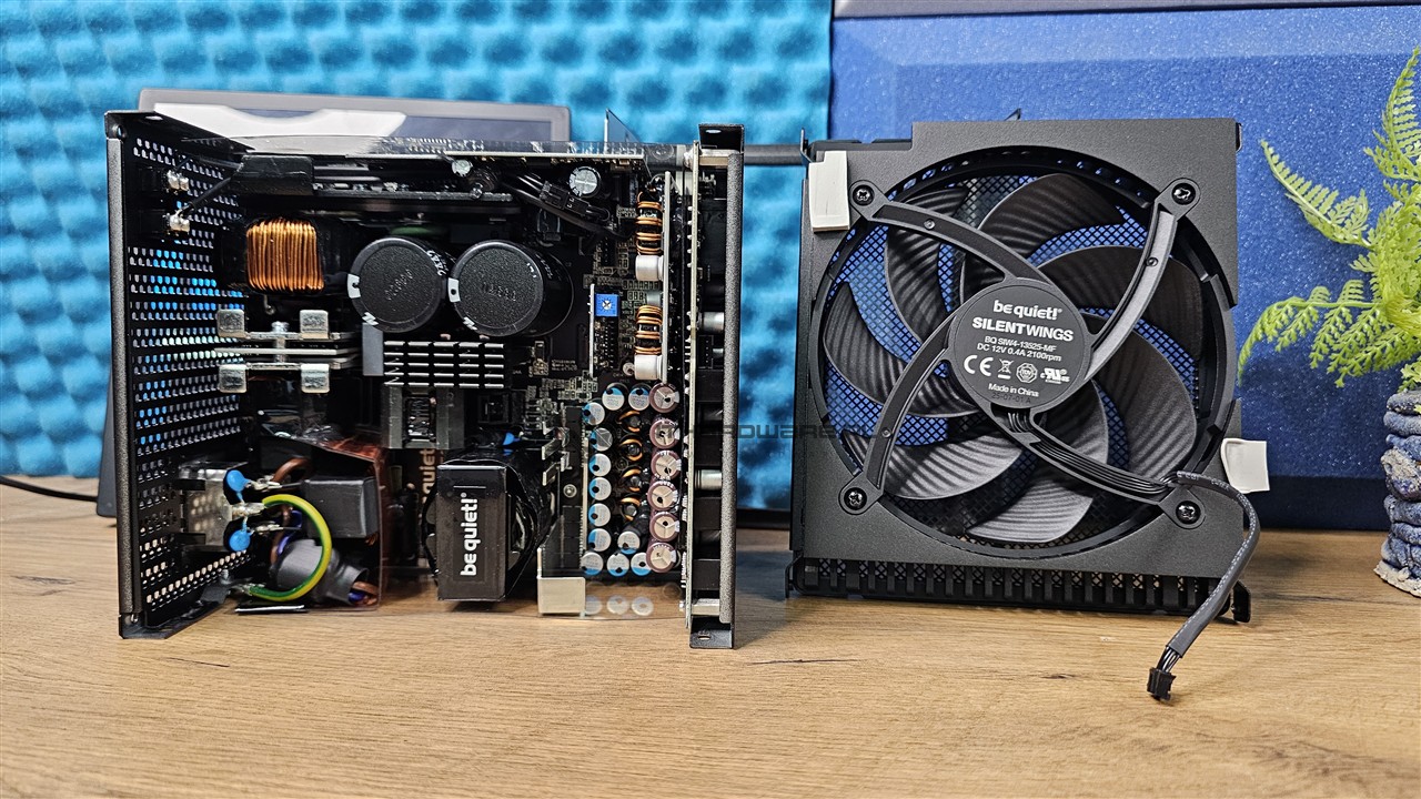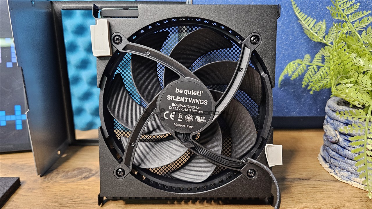 Za chłodzenie elektroniki odpowiada autorski, 135-milimetrowy wentylator be quiet! Silent Wings o maksymalnej prędkości 2100 obr./min, oznaczony jako BQ SIW4-13525-MF. Zastosowano tu łożysko FDB oraz 6-polowy silnik, co pozwala na płynną pracę przy niskich obrotach. Wentylator nie ma klasycznej ramki — zamiast niej mamy dwa prowadzące elementy, tworzące lej, co zmniejsza turbulencje i hałas.