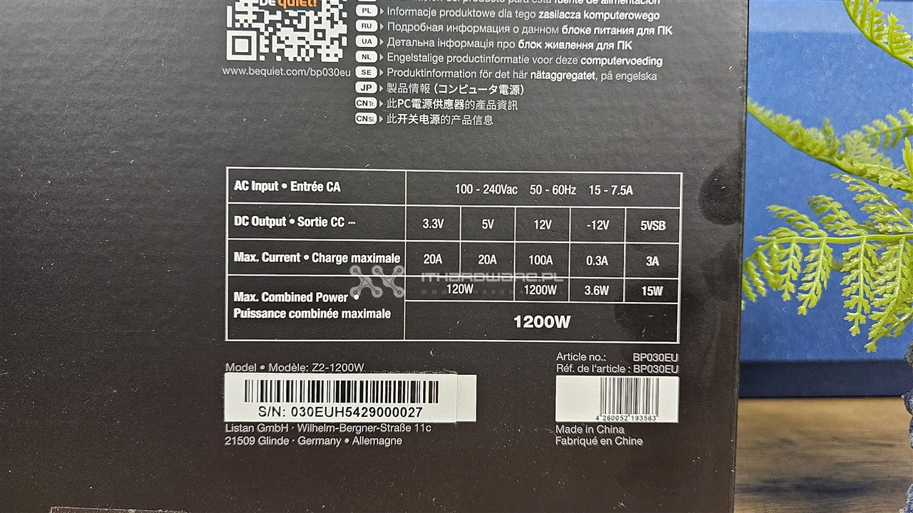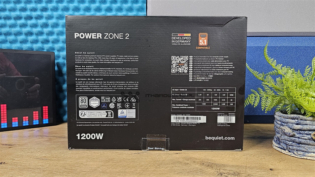 Zasilacz jest zapakowany w typowy dla be quiet! karton o czarnej kolorystyce, na froncie znajdziemy informacje dotyczące modelu, mocy PSU, certyfikatu 80 PLUS, Cybenetics w wersji Platinum oraz poglądowe zdjęcie zasilacza. Z tyłu mamy dodatkowe informacje dotyczące tabliczki prądowo-napięciowej oraz kod QR przenoszący nas do strony produktu. Obok "Developed in Germany" znalazła się informacja o złączu PCIe 5.1.