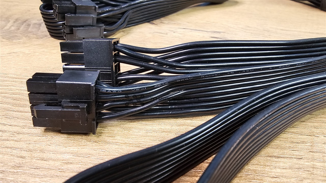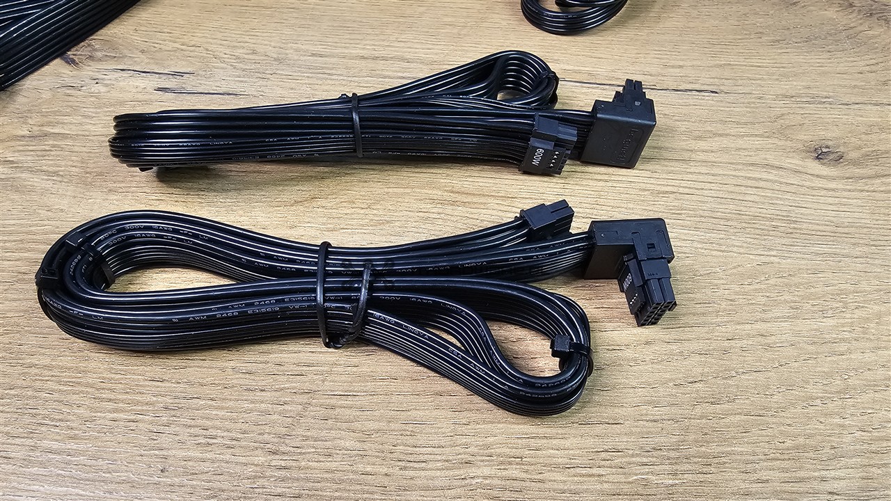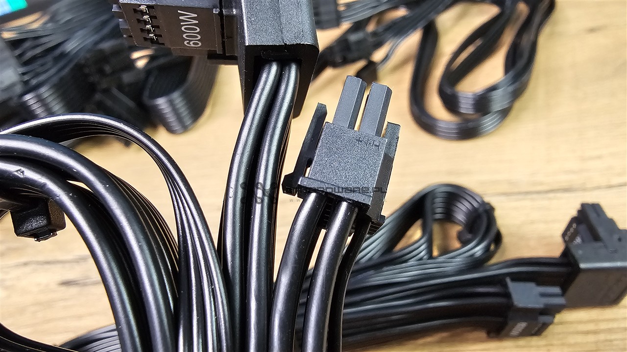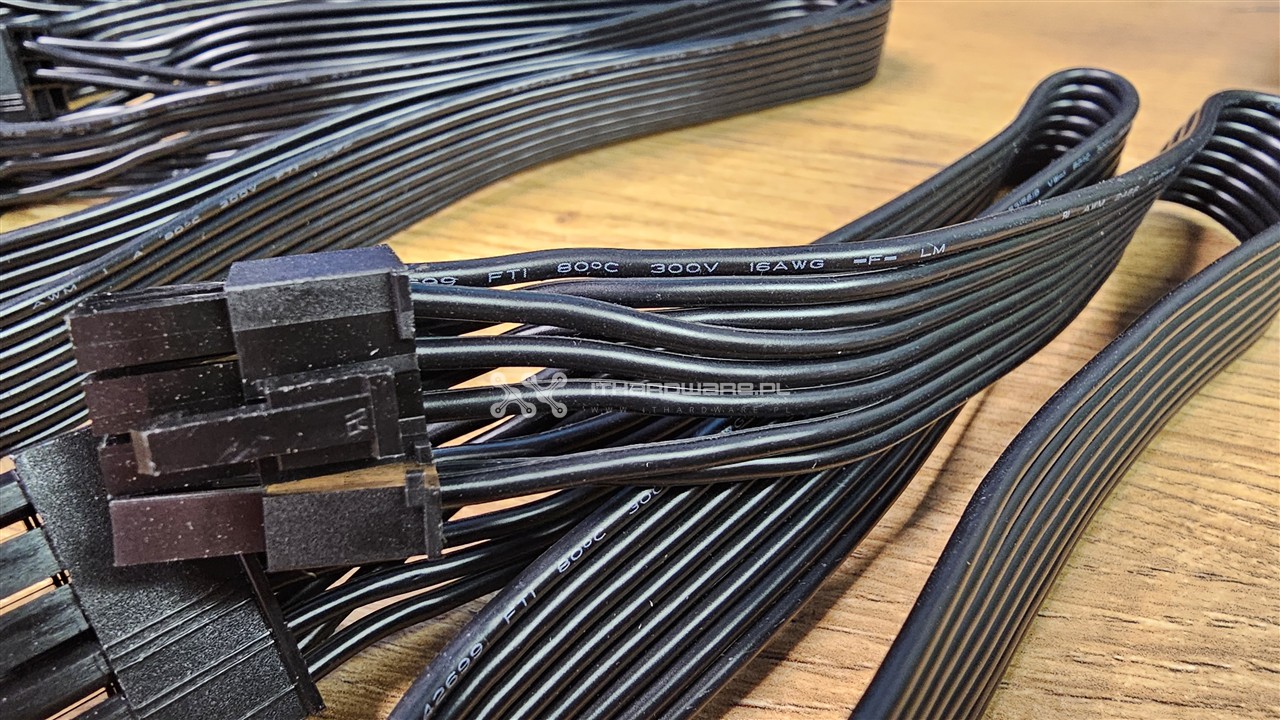 Oprócz wiązki głównej z dzielonym złączem 24-pin mamy do dyspozycji dwa kable EPS, trzy wtyczki PCI-E (6+2)-pin oraz dwa kable PCIe 5.1 12V-2x6 o mocy 600 W z kątowym wtykiem do GPU. Nośniki danych lub różnego rodzaju kontrolery podłączymy dwoma wiązkami, z czego jedna jest ze złączami SATA, a jedna z trzema wtykami SATA oraz jednym Molex. Kable są wystarczająco długie, ale z uwagi na większy przekrój 16 AWG są sztywne, więc polecam podgrzać suszarką do włosów przed montażem PSU w obudowie.