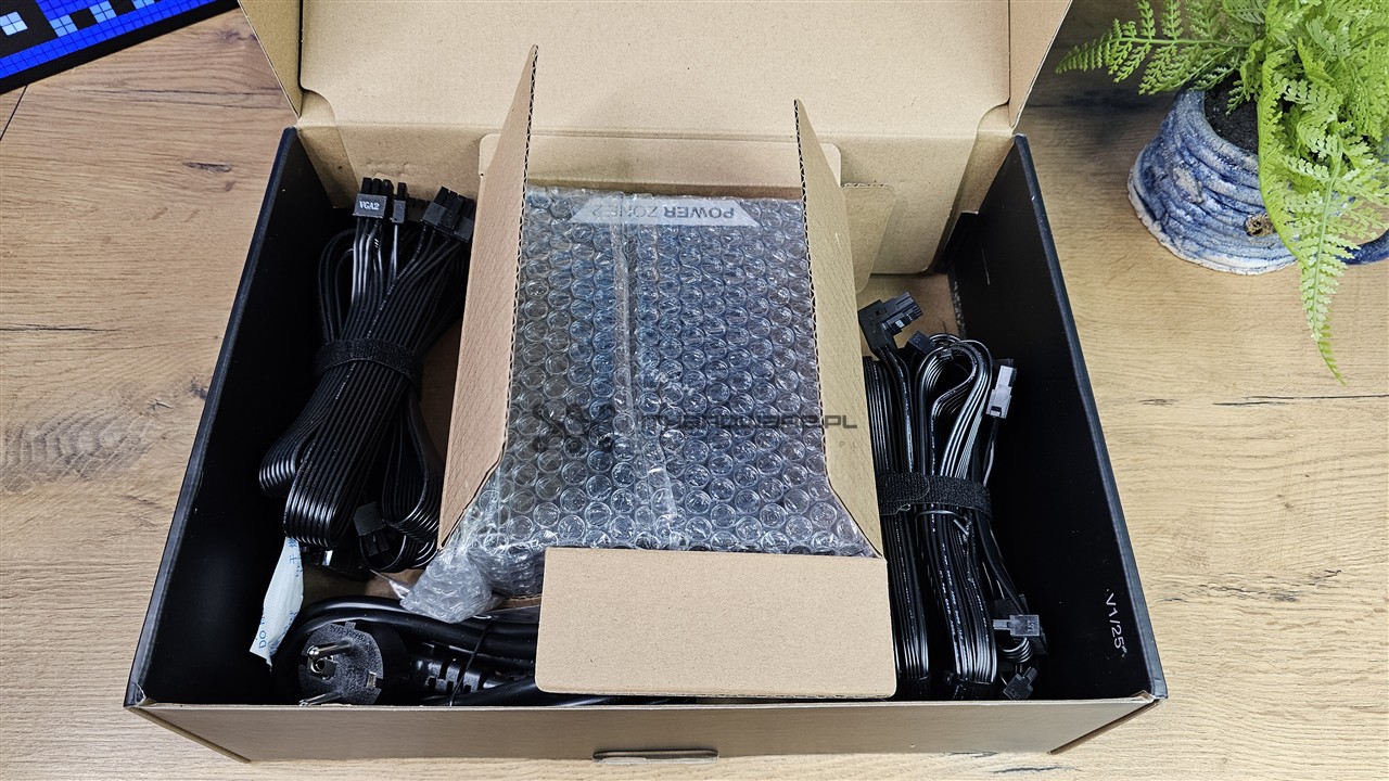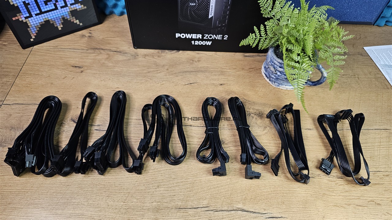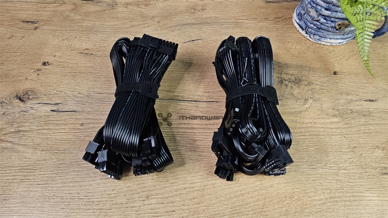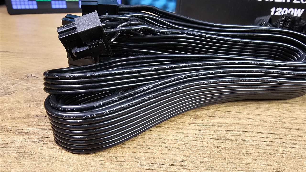 Oprócz wiązki głównej z dzielonym złączem 24-pin mamy do dyspozycji dwa kable EPS, trzy wtyczki PCI-E (6+2)-pin oraz dwa kable PCIe 5.1 12V-2x6 o mocy 600 W z kątowym wtykiem do GPU. Nośniki danych lub różnego rodzaju kontrolery podłączymy dwoma wiązkami, z czego jedna jest ze złączami SATA, a jedna z trzema wtykami SATA oraz jednym Molex. Kable są wystarczająco długie, ale z uwagi na większy przekrój 16 AWG są sztywne, więc polecam podgrzać suszarką do włosów przed montażem PSU w obudowie.