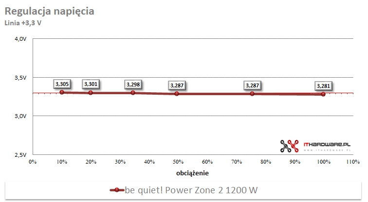 Zobaczmy, jak wyglądała regulacja napięć na poszczególnych liniach. Napięcia 3,3 V, 5 V i 12 V zostały oznaczone na wykresach czerwoną linią. Producenci dążą do tego, by regulacja na wszystkich liniach nie przekraczała 3%. Jest to typowe podejście dla zasilaczy ze średniej i niskiej półki cenowej. W hi-endzie wymaga się, by nie przekraczała 1%.