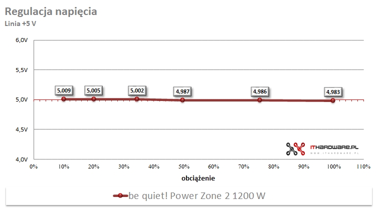 Regulacja napięć w zasilaczu be quiet! Power Zone 2 1200 W stoi na bardzo dobrym poziomie i bez problemu mieści się w granicach specyfikacji ATX. Dla linii +3,3 V maksymalne odchylenie wyniosło 0,73%, natomiast w przypadku +5 V odnotowano 0,52%. Kluczowa linia +12 V charakteryzowała się stabilnością na poziomie 1,08%, co można określić jako regulację napięć na poziomie jednostek premium.