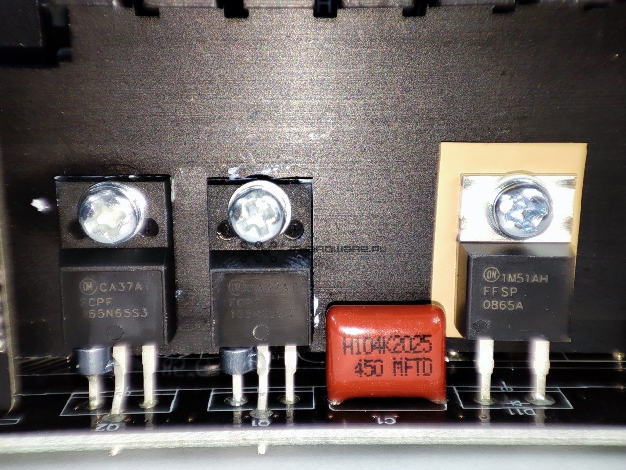 W układzie aktywnego PFC znajdziemy dwa tranzystory ON Semiconductor FCPF165N65S3. Charakteryzują się one parametrem RDS(on) na poziomie 165 mΩ i są w stanie dostarczyć 19 A w trybie ciągłym przy 25 °C. Mamy tutaj także 8-amperową diodę Schottky’ego FFSP0865A.