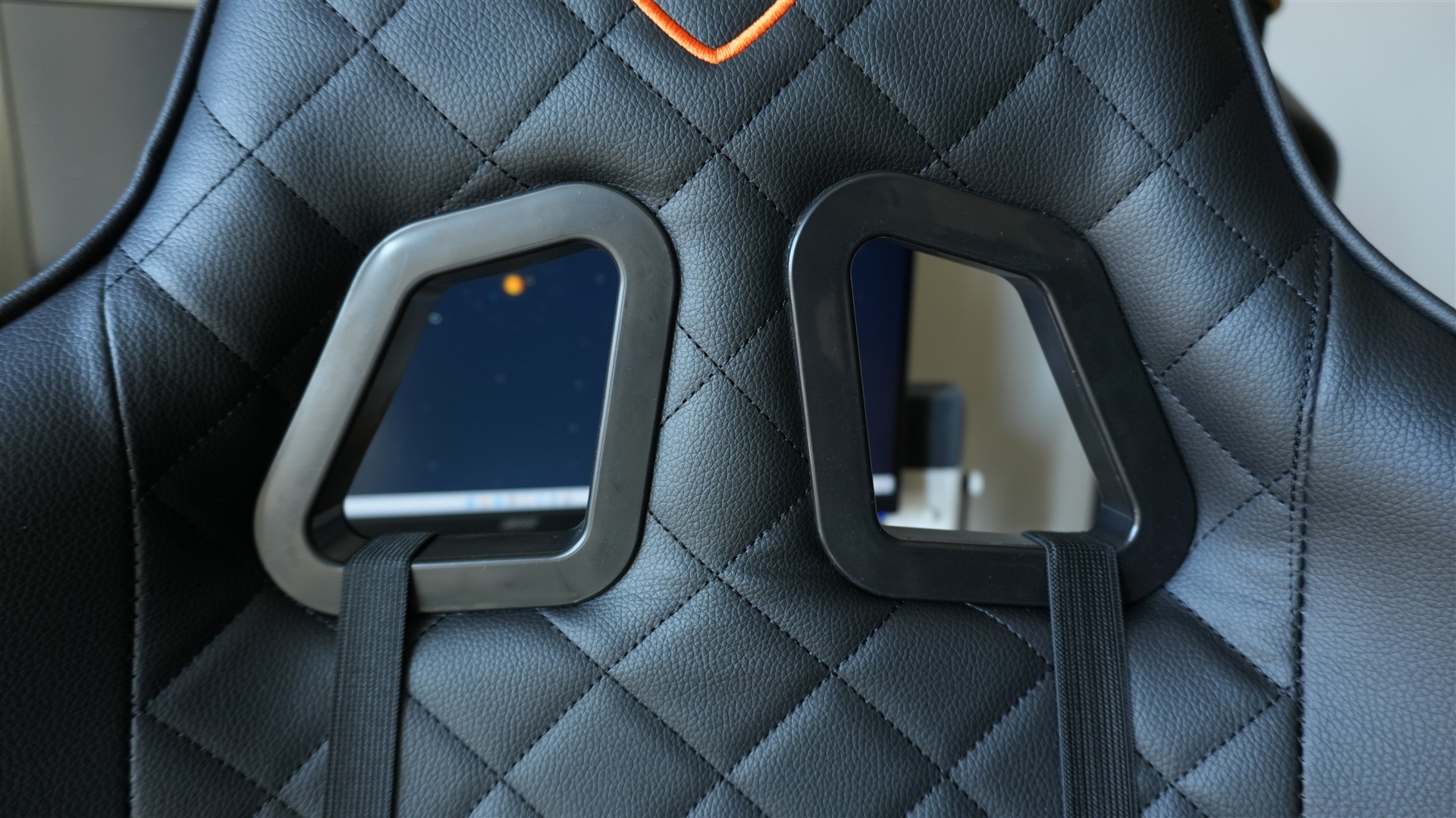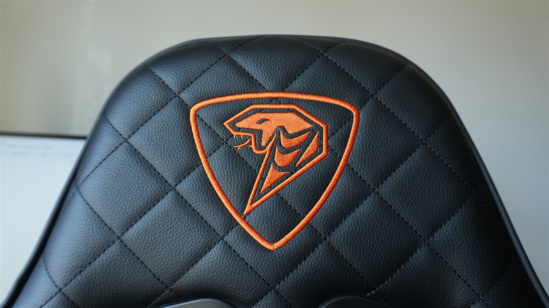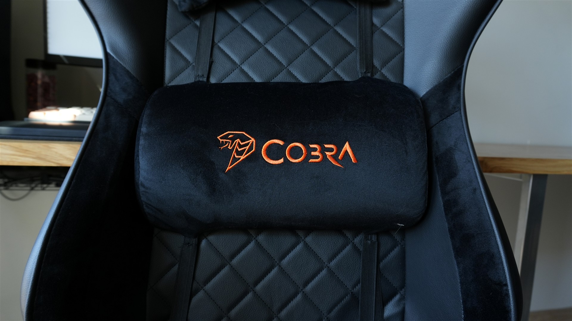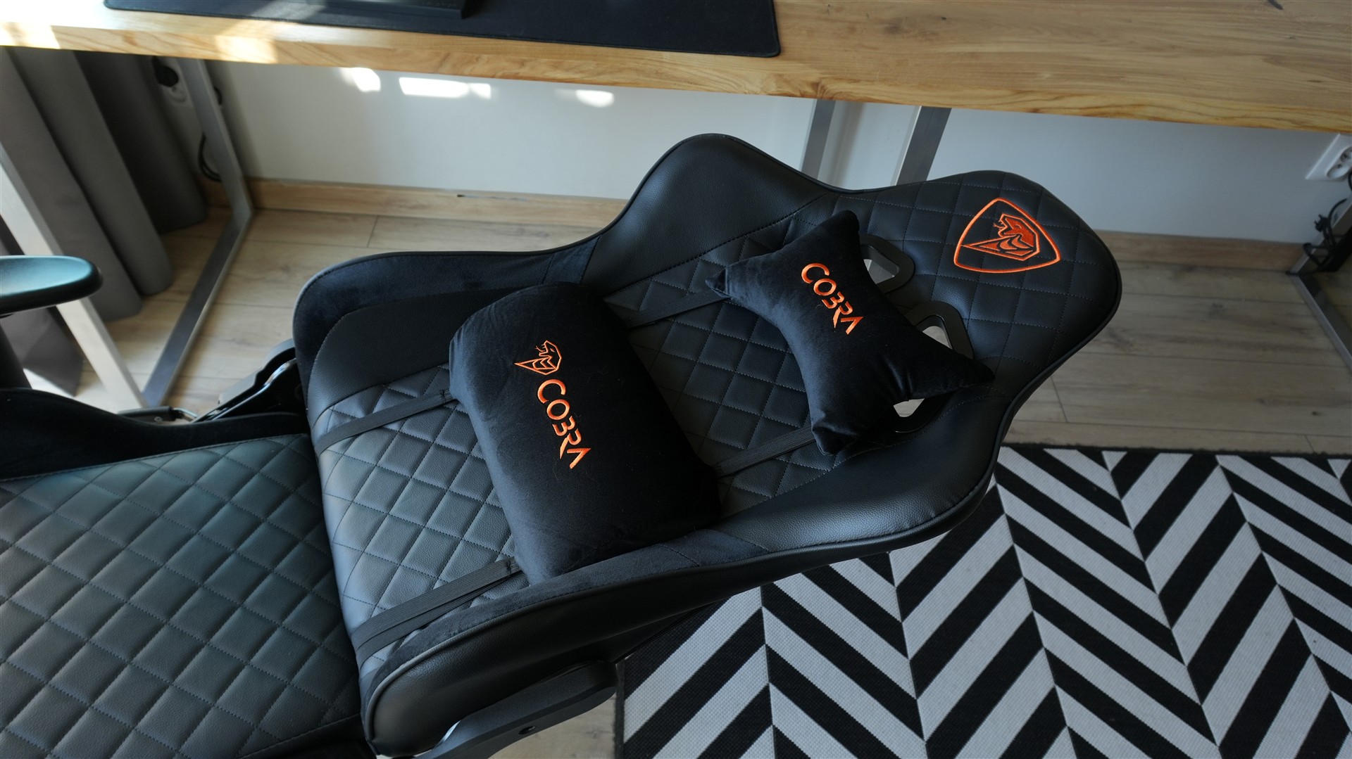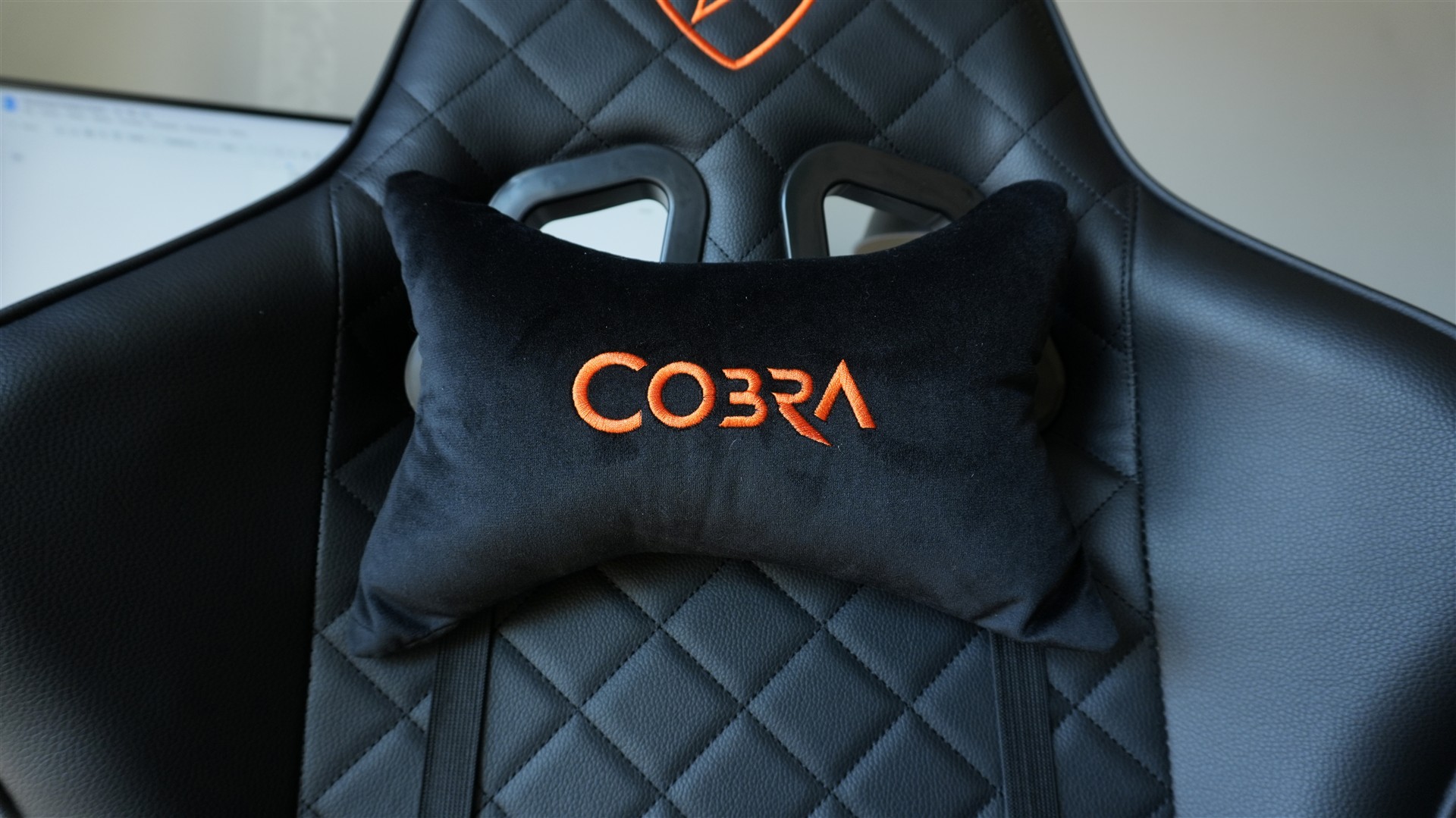 Na siedzisku, oparciu i zagłówku obszycie zostało dodatkowo pokryte wzorem składającym się z obróconych kwadratów. Tworzą je nitki czarne przechodzące w odpowiednich miejscach. Oprócz tego znajdziemy jeszcze dwa stricte estetyczne akcenty. To dwa wyszywane symbole marki Cobra umieszczone z przodu i z tyłu zagłówka. W górnej części fotel znajdziemy też dwa otwory z plastikowymi otoczkami. Pełnią one dwie role: po pierwsze nadają fotelowi ciekawsze, bardziej sportowego wyglądu, a po drugie służą do przełożenia pasków od dołączonych poduszek. Otworom tym można jeszcze przypisywać funkcję wentylacji, ale w praktyce połowę i tak zakrywa poduszka.