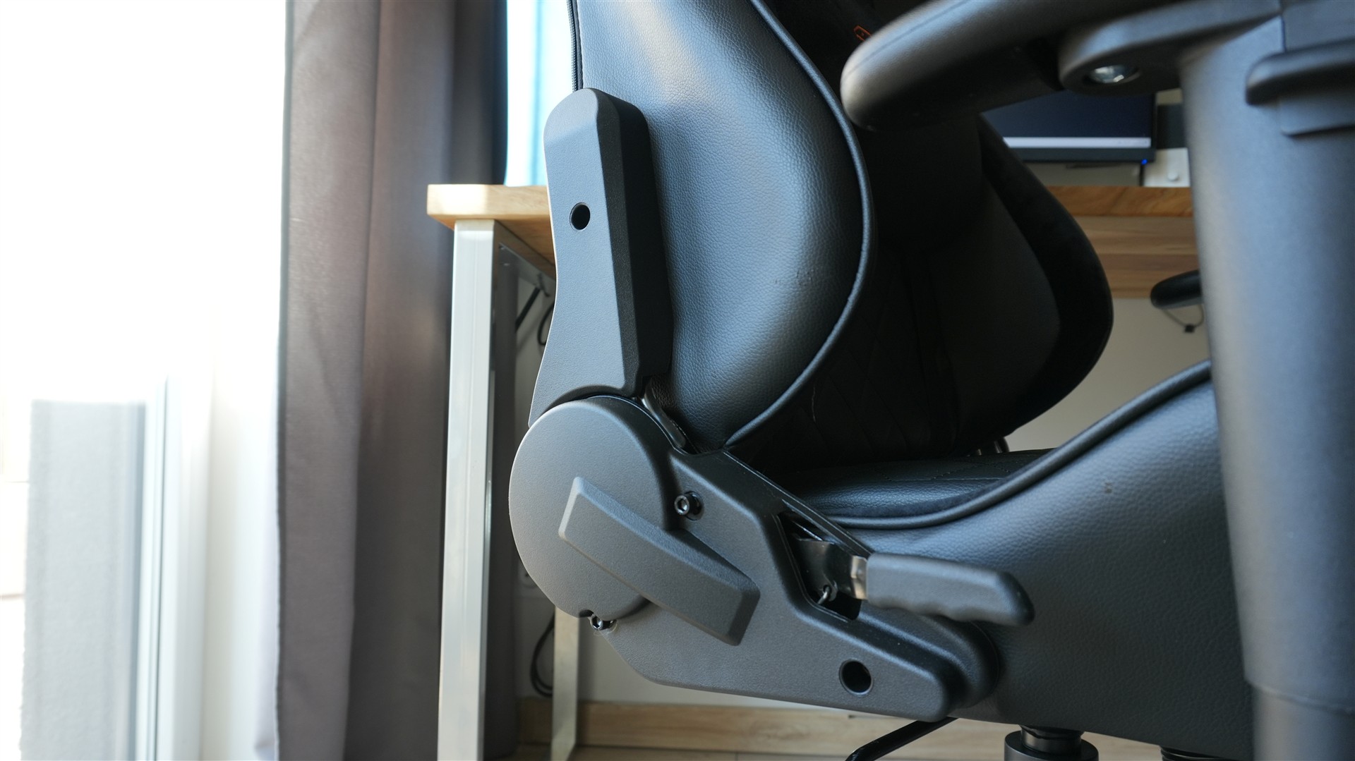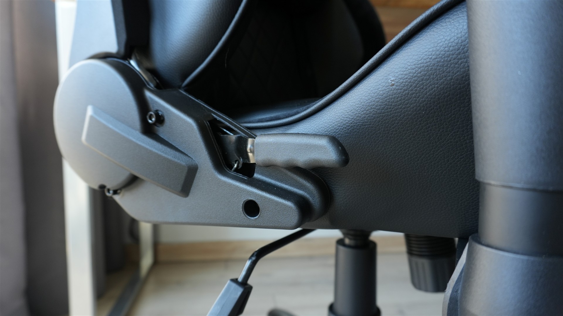 Kolejnym elementem praktycznym jest dźwignia znajdująca się na boku siedziska po prawej stronie. To właśnie ten element pozwala regulować pochylenie oparcia. Co dość mocno mnie zaskoczyło, fotel pozwala na całkowite przestawienie oparcia do pozycji leżącej. Od razu jednak was ostrzegę, żeby korzystać z tego ostrożne, bo fotel daje wtedy wrażenie jakby mógł łatwo się przewrócić. Niemniej leżenie jest możliwe, tylko bez zbędnego wiercenia się. Oparcie można rzecz jasna pochylić wedle uznania, może być to tylko trochę, tak by nie siedzieć zupełnie pionowo. Przyczepię się jednak do samego działania tej regulacji. Dźwignia jest dość nieprzyjemna, potrafi zawiesić się na chwilę w jakimś położeniu, by później odbić, a jej pociągnięcie na początku wywołuje metaliczny dźwięk. No i całość nie jest też super precyzyjna, bo w praktyce będziemy regulować odchylenie plecami, więc osiągnięcie idealnego położenia oparcia może wymagać 2-3 prób.