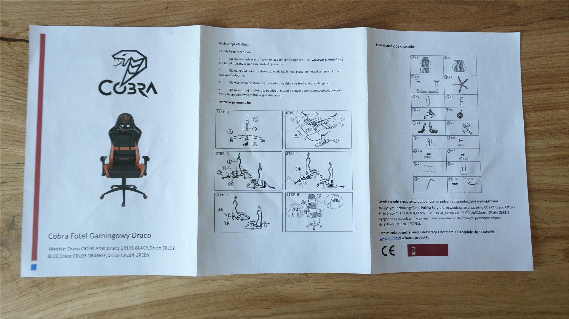 Zacznę od tego, od czego również i Wy będziecie zaczynać, jeśli postawicie na ten (lub każdy inny) fotel. Czyli od montażu. A ten przebiega całkiem sprawnie, choć muszę przyczepić się do obrazkowej instrukcji. Nie wiem czy to już efekt rozpieszczenia przez szczegółowe instrukcje dołączane często do obudów komputerowych, ale w przypadku Cobry naprawdę dałoby się to zrobić choć trochę czytelniej, nawet przez zwiększenia rozmiaru samych obrazków. Mimo wszystko nie jest to skomplikowany mebel, więc jego montaż tak czy inaczej jest prosty i całkiem szybki. Wszystkie śrubki zostały umieszczone w osobnych rubrykach z oznaczeniem, a w komplecie znajdziemy także potrzebny klucz imbusowy.