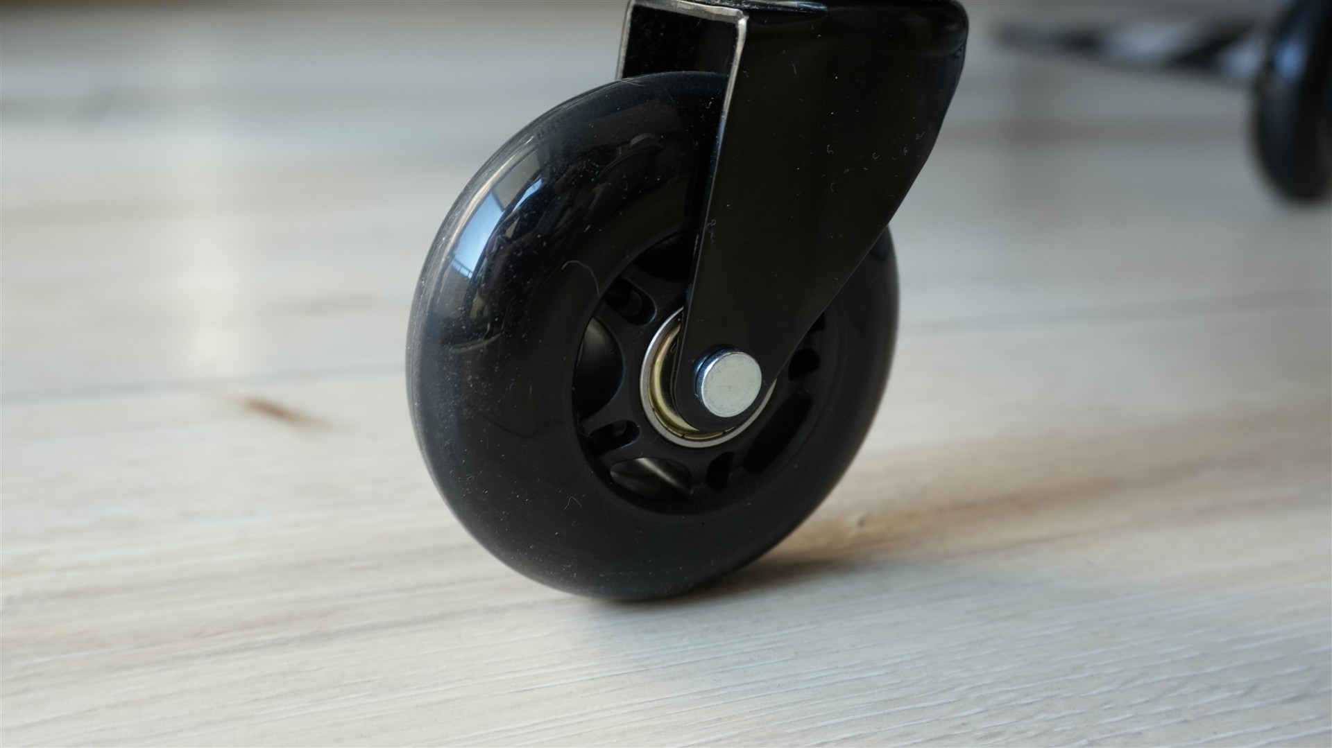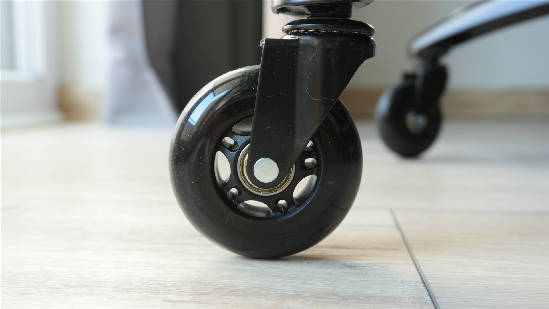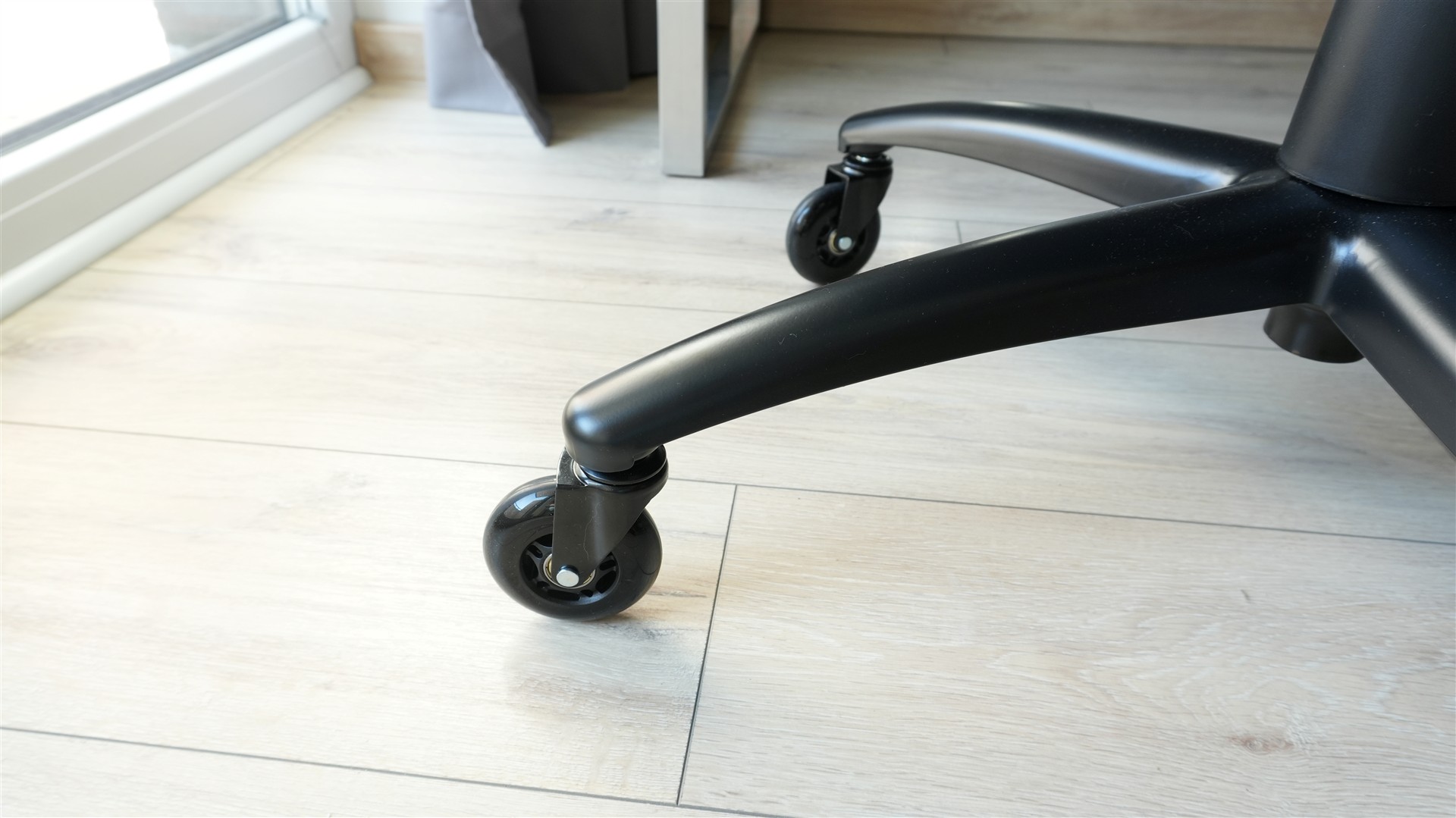 No to już teraz nie mieszając zalet z wadami. Pozytywnie zaskoczyły mnie kółka. Same  łożyska pracują wzorowo. Dają gładki ślizg kółka po panelach czy dywanie sprawiając, że przesuwanie się fotelem przy biurku jest szybkie i zwyczajnie przyjemne. Podoba mi się także użycie ekoskóry. Tak wiem co może się stać z nią po czasie, pisałem o tym we wcześniejszym etapie recenzji. Ale zastosowanie właśnie tego materiału sprawia, że fotel wygląda bardziej estetycznie i łatwiej można go wyczyścić. Doceniam też pokrycie boczków i poduszek welurowym materiałem. Jest on bardzo miły w dotyku i nadaje całości jeszcze ciekawszego wyglądu.