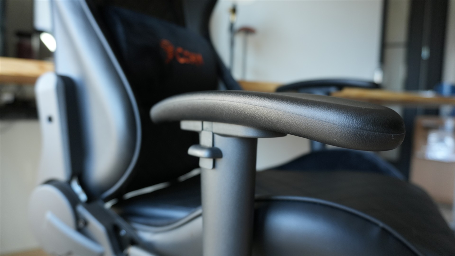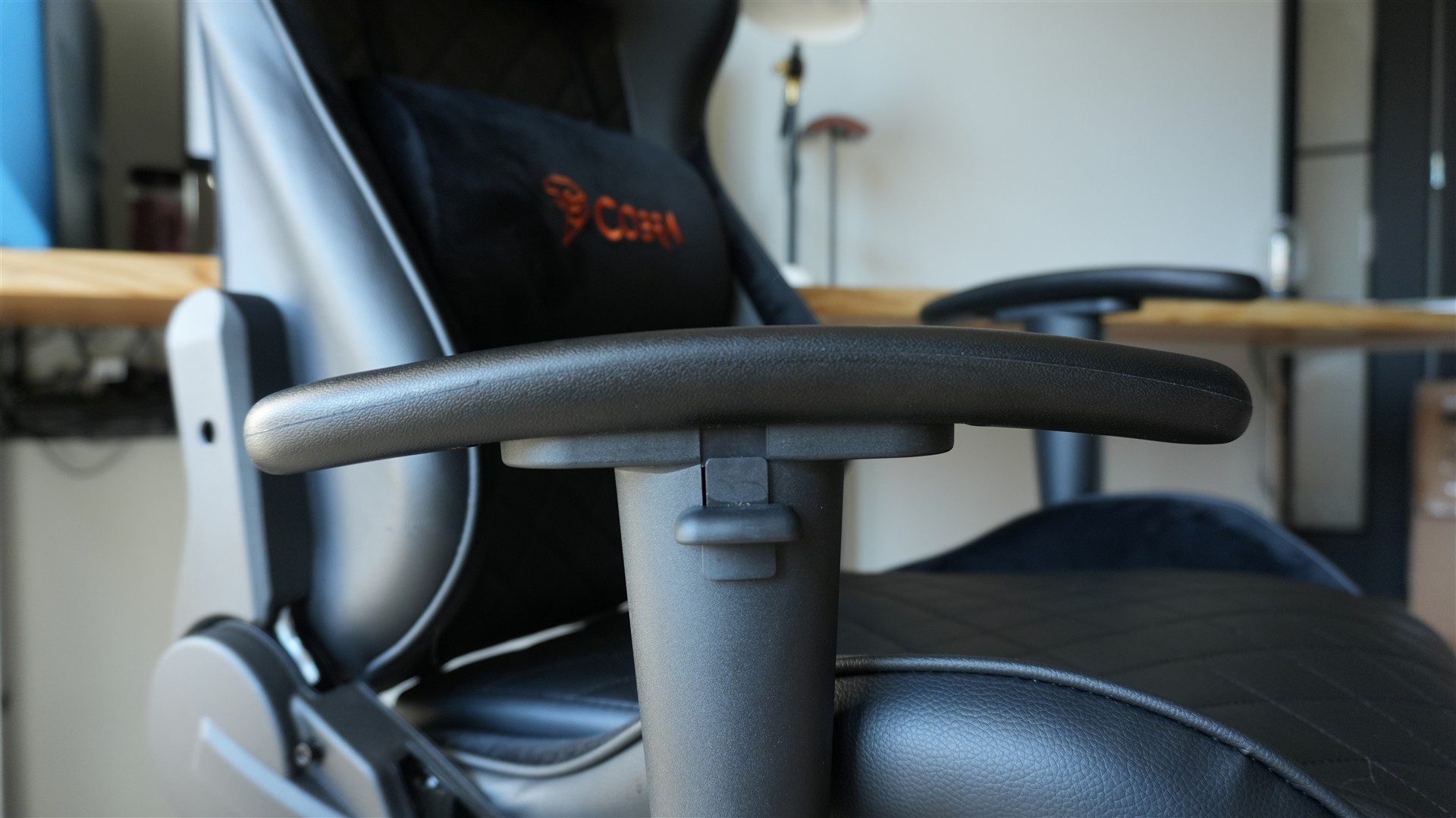 Będąc już w temacie materiałów koniecznie dodajmy, że większość tego fotela została pokryta skórą ekologiczną PU. Rozwiązanie to sprawia, że całość wygląda bardziej premium. Oczywiście to kwestia gustu, ale osobiście podoba mi się to bardziej niż fotele wykonane z siatki czy pokryte jakimś rodzajem tkaniny. Skóra ekologiczna powinna być również dosyć łatwa w czyszczeniu. Ale żeby nie było tak słodko, ma ona jedną poważną wadę. I chodzi tu o pękanie po czasie. Ten, kto miał coś pokrytego ekoskórą dobrze wie, że ten materiał po czasie lubi zwyczajnie kruszeć i odchodzić. Jest również bardzo podatny na zadrapania, po których na zostają takie nieładne zadziory. Krótko mówiąc skóra ekologiczna nie jest idealna. Daje bardzo estetyczny wygląd będąc jednocześnie stosunkowo tanim materiałem, ale wymaga większej uwagi i dbałości, żeby jej nie zniszczyć. Chociaż z doświadczenia wiem, że nawet przy takim dbaniu po czasie i tak może zacząć odchodzić. Nie wiem jak dokładnie będzie w przypadku tej Cobry, bo musiałbym ją testować przez znacznie dłużej, ale powiedzmy, że nie mam najlepszego doświadczenia z ekoskórą.