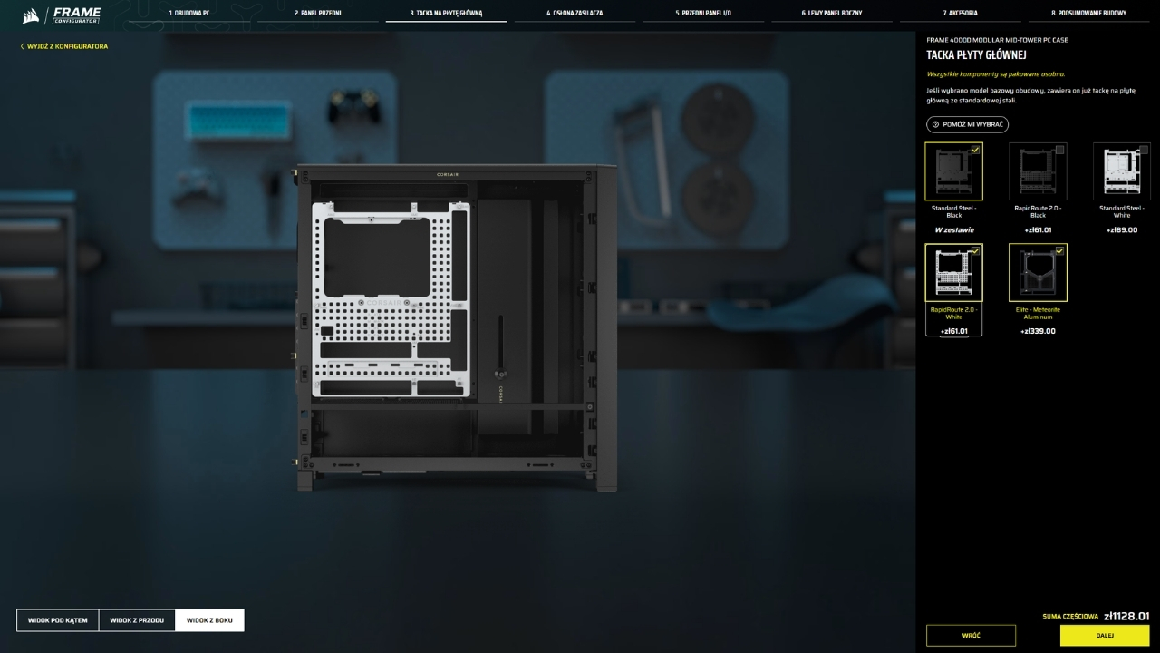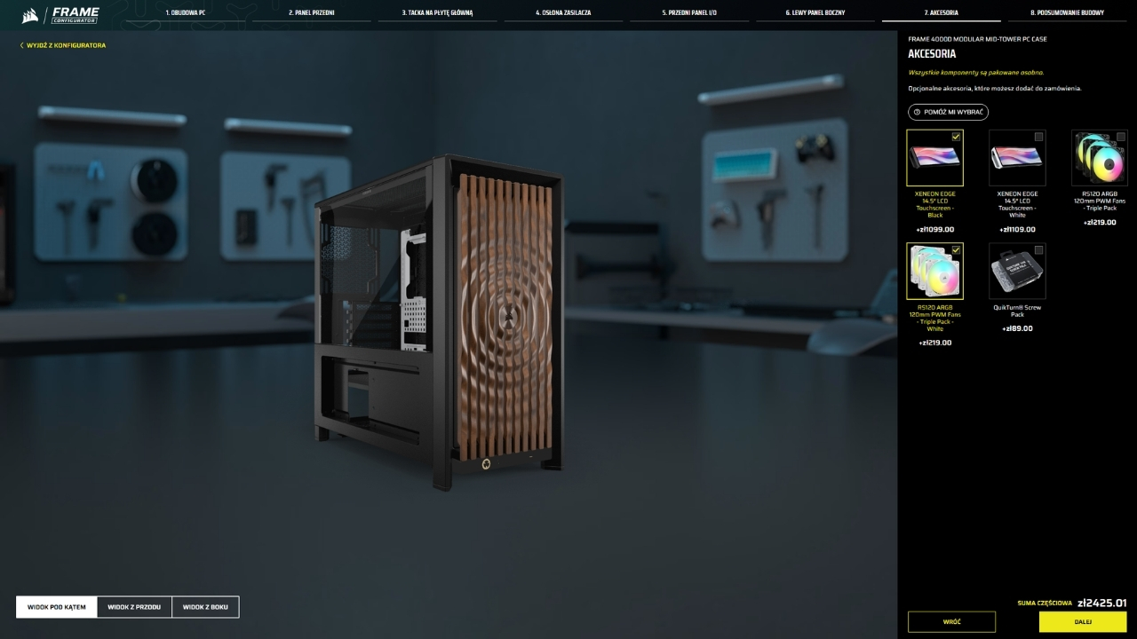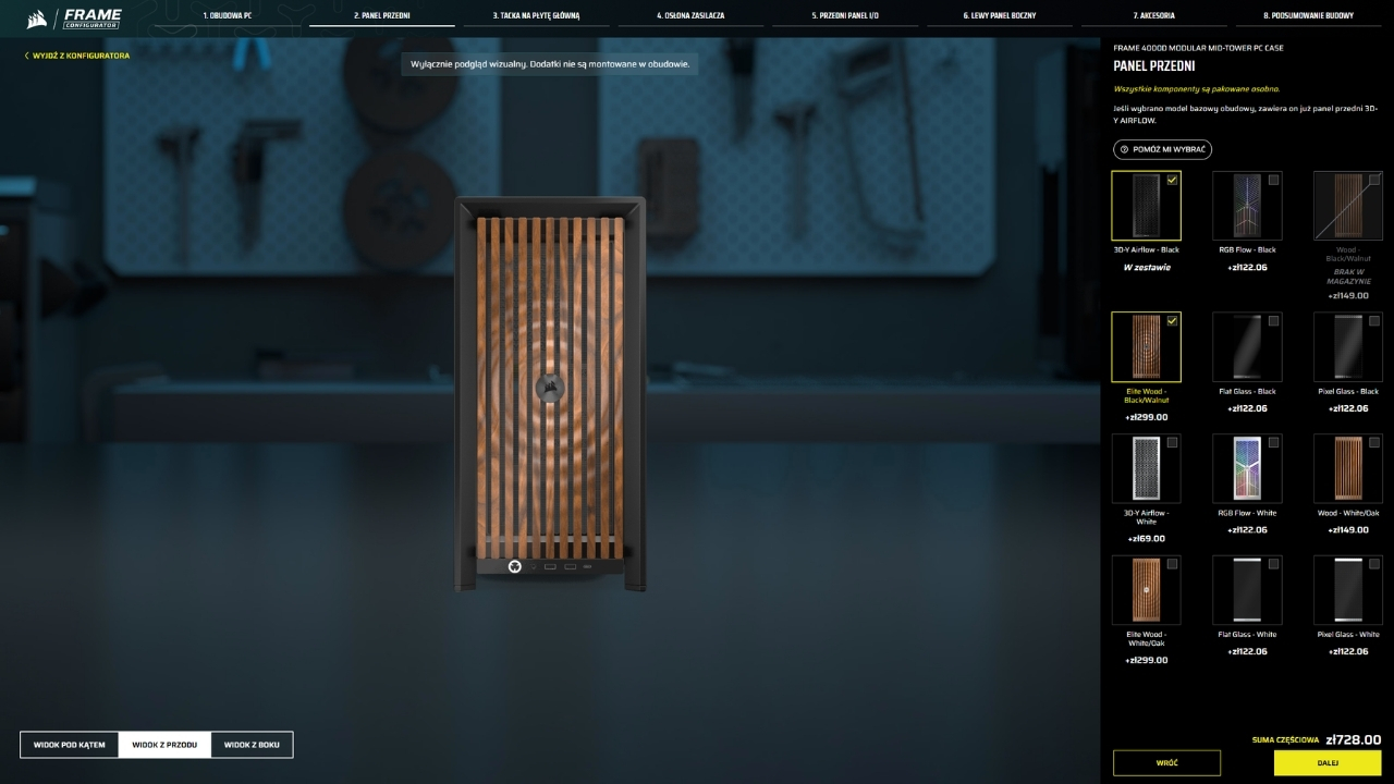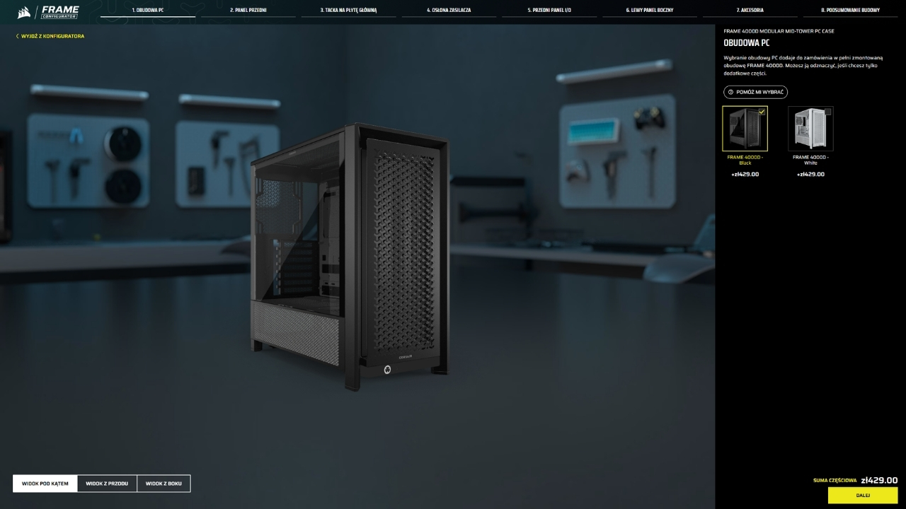 Cieszy mnie, że producent to wszystko uporządkował. Corsair przygotował dedykowaną stronę do wizualizacji możliwych konfiguracji. Narzędzie nazwano Frame Configurator, a dostęp do niego mamy od stosunkowo niedawna, bo od 7 kwietnia. Wystarczy wejść na stronę z linku, wybrać obudowę, a następnie dopasować pozostałe wymienne elementy (znajdziecie tam również ceny poszczególnych elementów). Dzięki temu zobaczymy jak może prezentować się wybrana konfiguracja, a przy okazji narzędzie podlicza całkowity koszt zestawu. Warto jeszcze dodać, że bazą w konfiguratorze jest model Frame 4000D wyceniony na 429 zł.