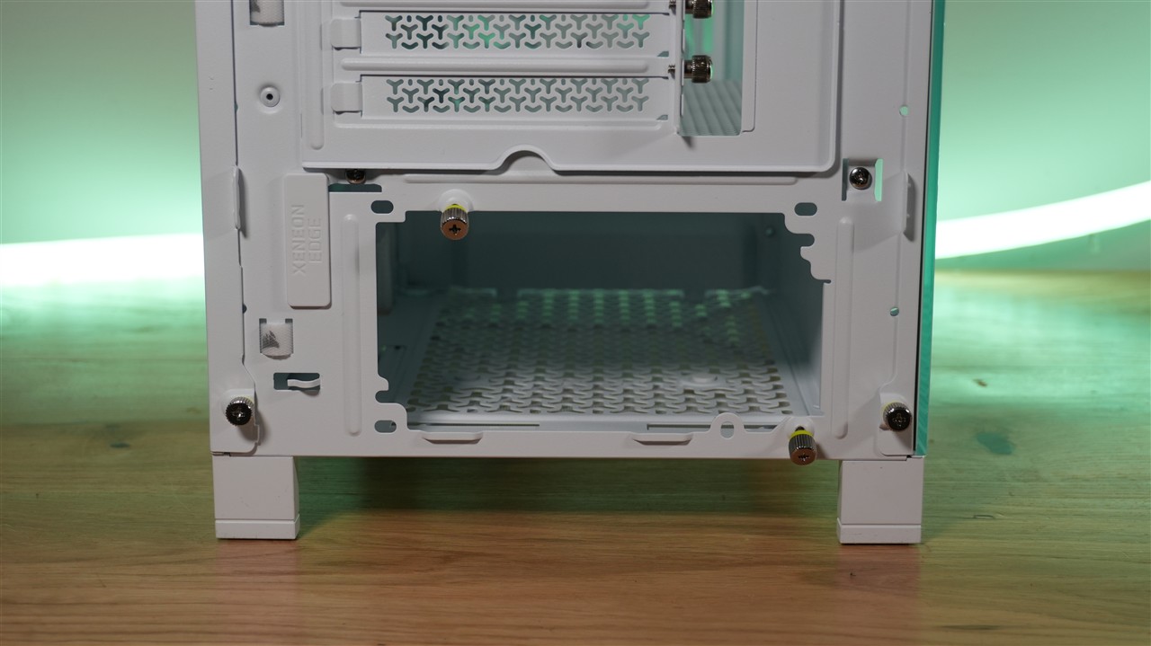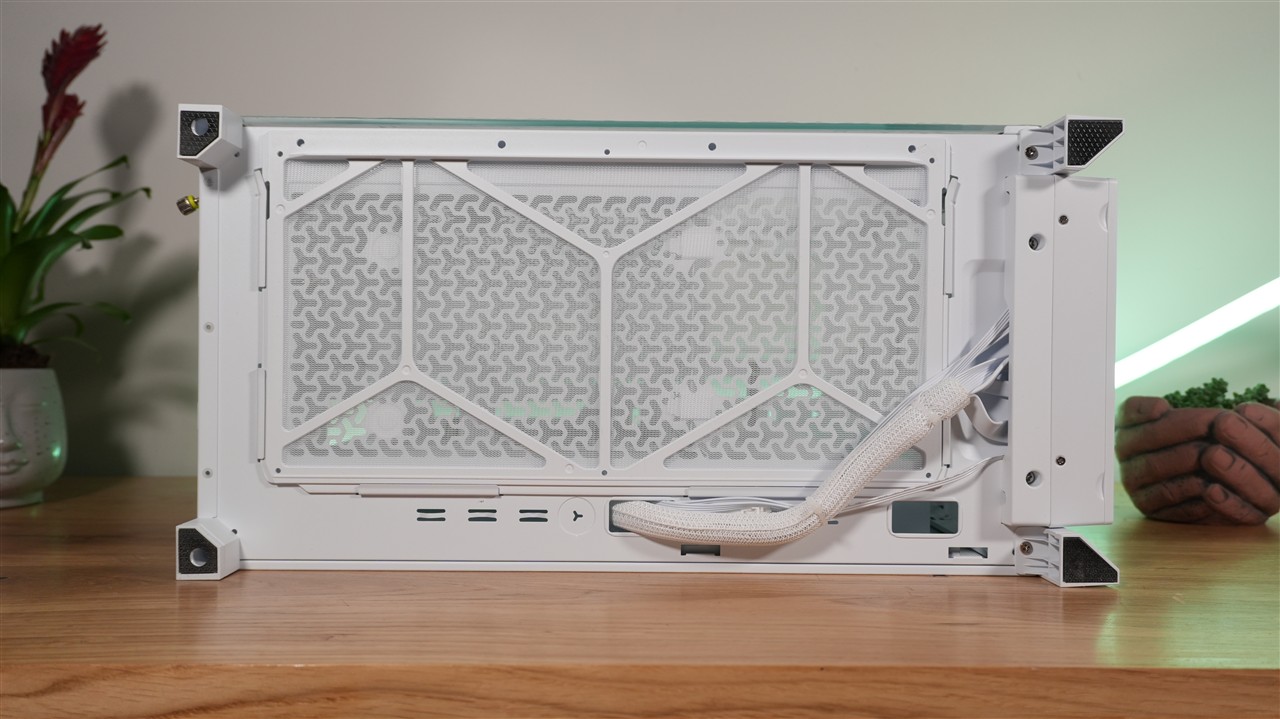 Spód tej obudowy został w znacznej części pokryty otworami wentylacyjnymi. A to w połączeniu z perforowaną osłoną komory zasilacza może dawać korzystne efekty jeśli zdecydujemy się zamontować wentylatory na spodzie. Warto również zwrócić uwagę, że użyto filtra siateczkowego, który co więcej jest łatwo demontowalny i trzyma się na szynach. Nóżki również otrzymały prawidłowe zabezpieczenie. Mógłbym tylko przyczepić się do mało estetycznie przechodzących w tym miejscu kabli z frontu. Nie wygląda to zbyt profesjonalnie, ale z drugiej strony i tak nie będzie tego widać.