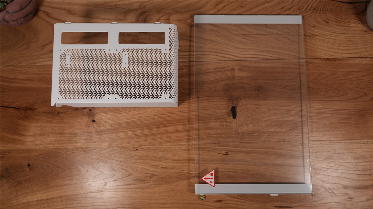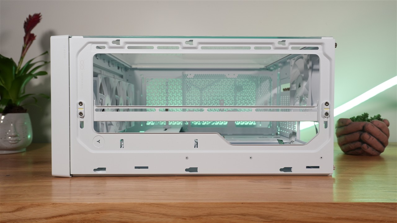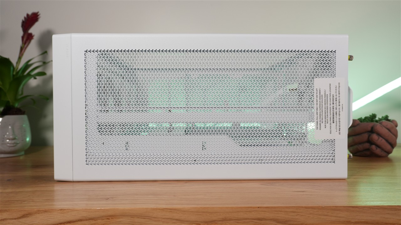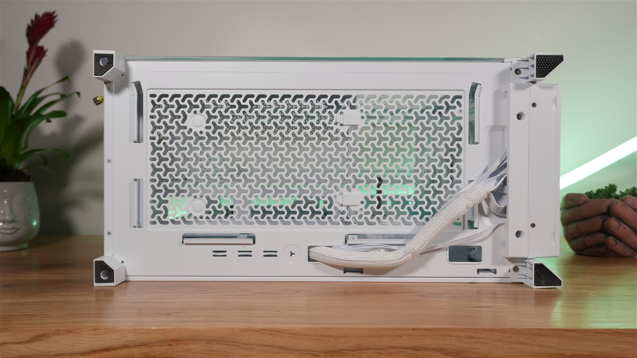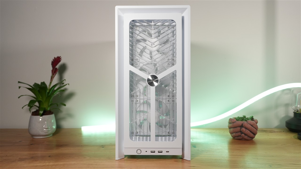 Patrząc na ten model od razu widać też, że projektantom zależało na jak najbardziej optymalnej wentylacji. Świadczą o tym przede wszystkim liczne i stosunkowo dużych rozmiarów wycięcia na górze, przodzie, boku, tyle, a nawet spodzie. Można powiedzieć, że obudowa jest mocno podziurawiona. To dobrze wróży w kwestii testów wydajności chłodzenia. Co do użytych materiałów, mamy tutaj mieszankę szkła, metalu oraz plastiku. Wszystko zostało ładnie spasowane, a biała wersja kolorystyczna, która akurat do mnie trafiła, prezentuje się na biurku wyjątkowo ładnie.