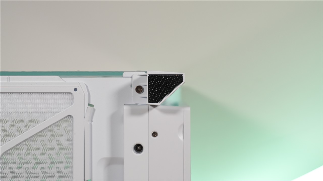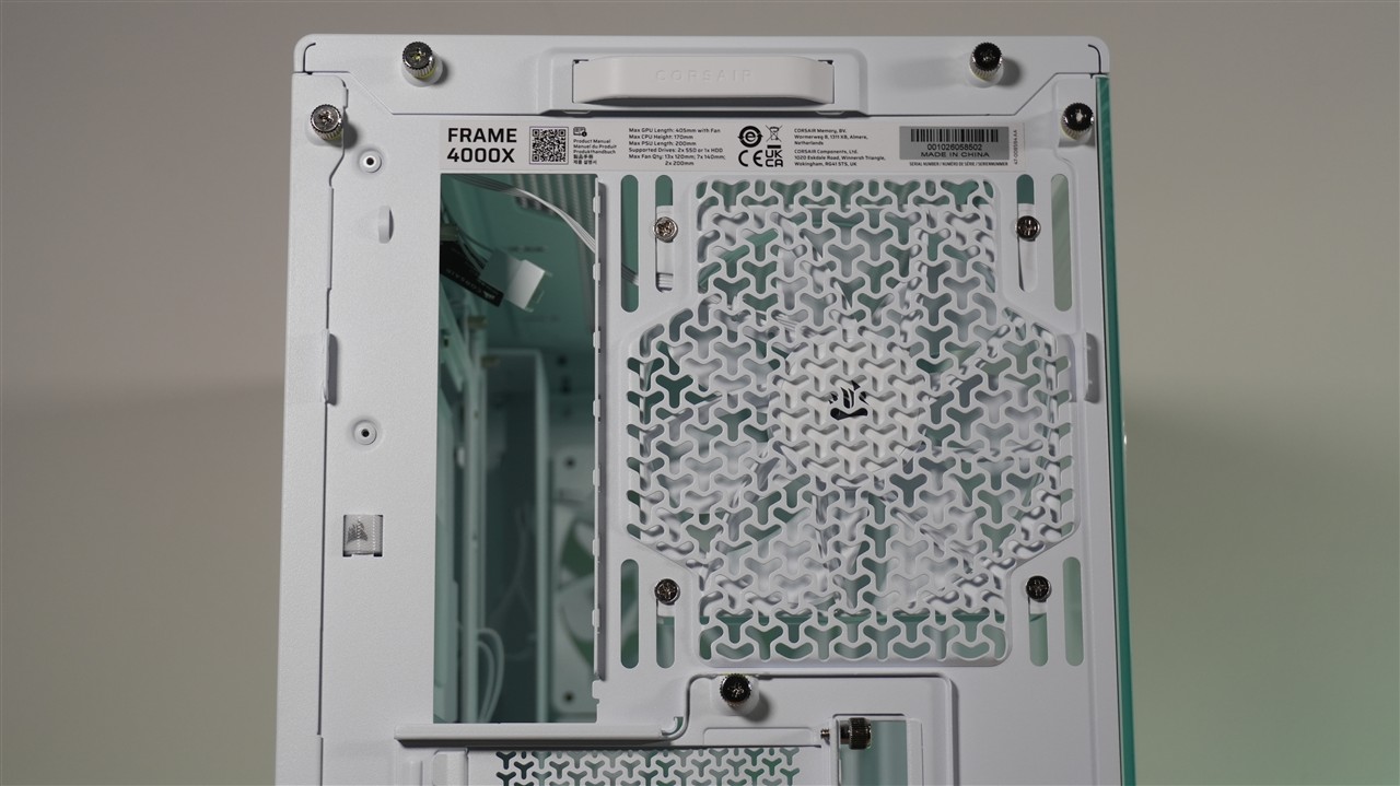 Górną część Corsair Frame 4000X RS stanowi przede wszystkim blaszany panel z dużymi otworami wentylacyjnymi. Tuż pod nim mamy z kolei regulowaną przy pomocy śrubek szynę do montażu wentylatorów 120 mm lub 140 mm. Oczywiście w tym miejscu można również przymocować radiator chłodzenia cieczą. Pomijając regulowaną szynę jest to klasyczna budowa topu. Jeśli miałbym do czegoś się przyczepić do jedynie do braku filtra przeciwkurzowego w tym miejscu, choć jak wielokrotnie już pisałem, jego obecność akurat tutaj nie jest szczególnie ważna.