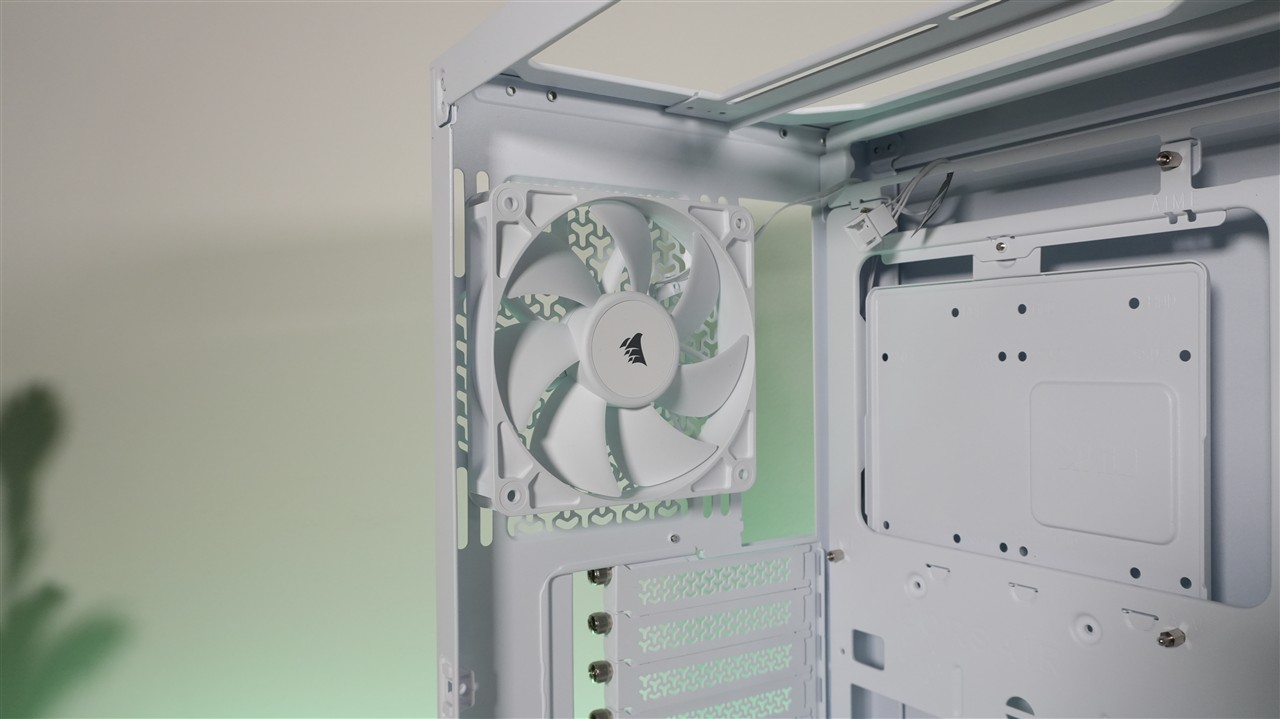 Fabryczny system chłodzenia składa się tutaj z czterech wentylatorów Corsair RS120: trzech na przodzie i jednego na tyle. Według specyfikacji obracają się one z prędkością w zakresie 420-2100 RPM. I faktycznie, oprogramowanie wskazało, że przy 100% sygnału PWM było to dokładnie 2102 RPM. Warto również dodać, że te wentylatory oparto na łożysku z kopułą magnetyczną, co ma skutkować wydłużoną żywotnością i obniżonym hałasem. O tym drugim przekonamy się już niebawem. Co do przepływu powietrza, wydaje się on być tutaj niczym niezaburzony. Praktycznie wszędzie mamy jakieś otwory wentylacyjne, a front i góra nie są zabudowane. To dobrze wróży w kwestii wydajności chłodzenia.