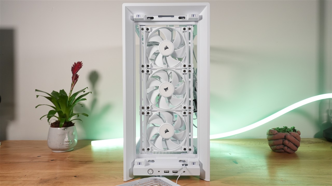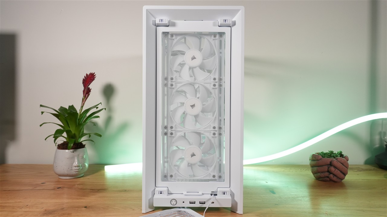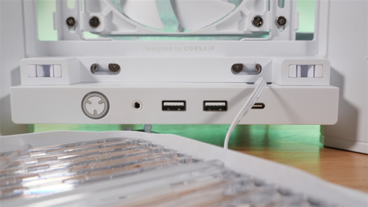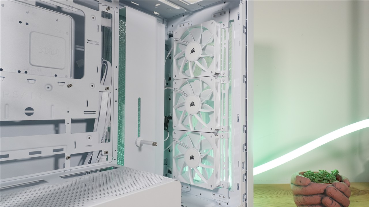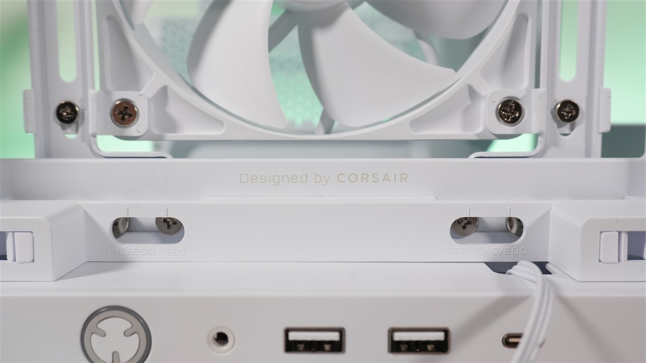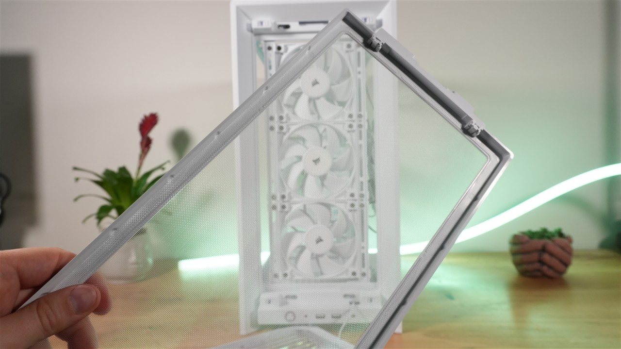W fabrycznej konfiguracji front przykrywa plastikowa panel z przezroczystymi lamelami. Pełni on zarówno rolę praktyczną, ze względu na umożliwienie swobodnego przepływu powietrza, jak i dekoracyjną, bo zaszyto w nim kolorowe diody LED. Użycie przezroczystych lameli w połączeniu z podświetleniem RGB daje bardzo ciekawy efekt, który zobaczycie na zdjęciach w sekcji „Efekt końcowy”. Przód obudowy jest również jedną z modyfikowalnych sekcji. Wspomniany przed chwilą panel można łatwo wymienić, a pod spodem znajduje również łatwo demontowalny filtr siateczkowy. Duży plus dla Corsair za użycie właśnie takiego rodzaju ochrony przed kurzem. Jeszcze dalej znajdują się natomiast trzy wentylatory przymocowane do szyny.
