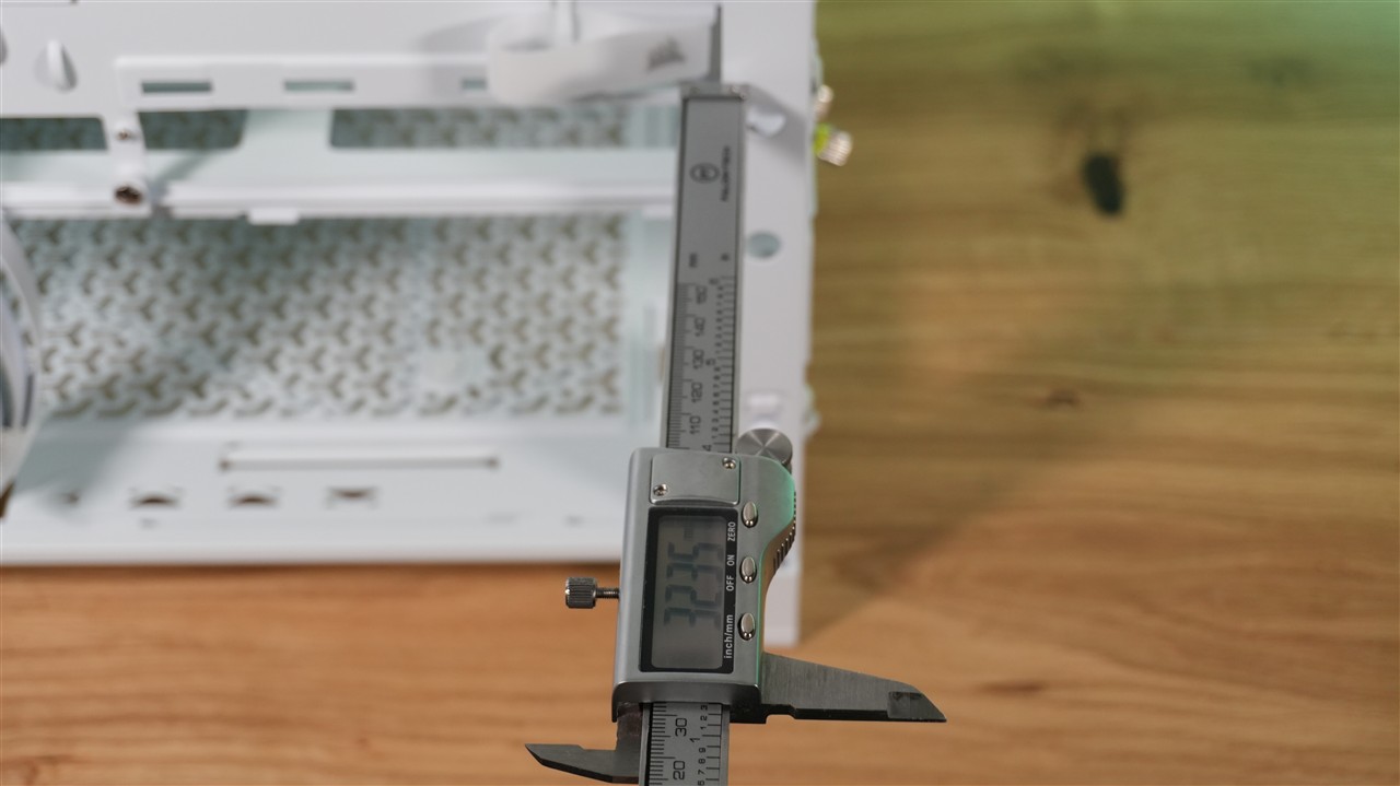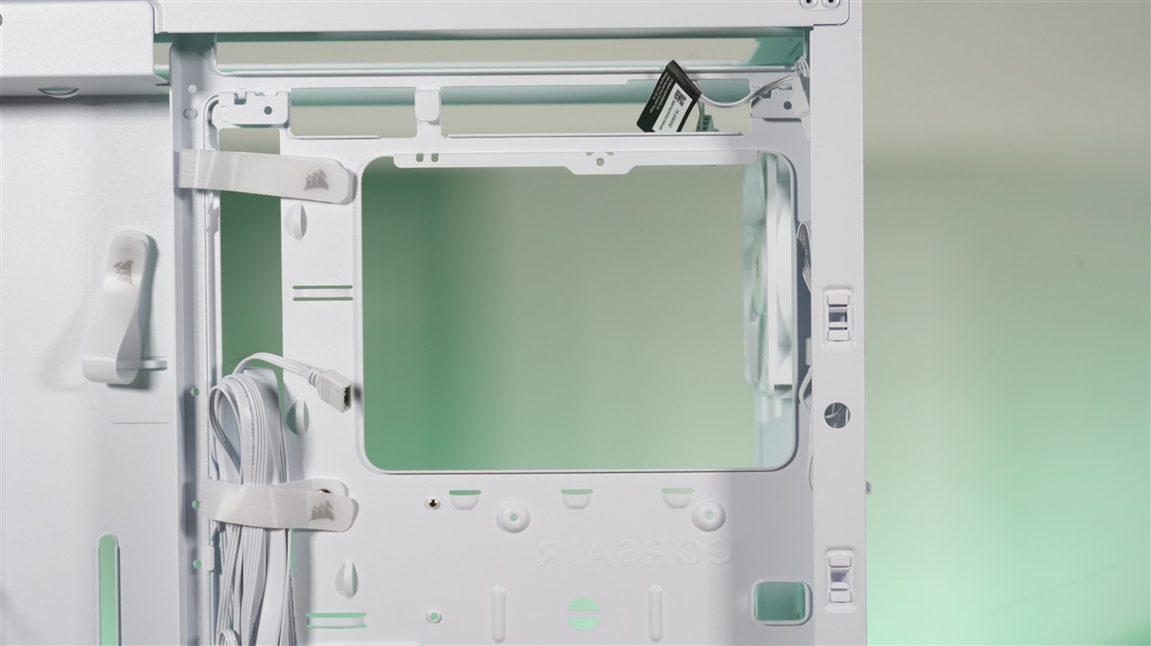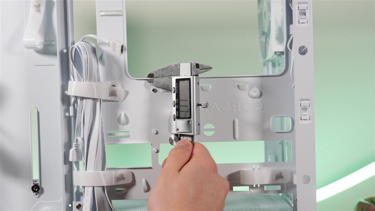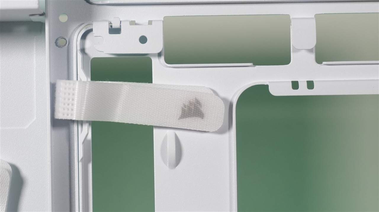 Za tacką płyty głównej nie znajdziemy w zasadzie nic szczególnie ciekawego. Całość została zaprojektowana po prostu dobrze. Mamy nieco ponad 32 mm miejsca na okablowanie, tackę służącą do montażu dysków oraz komorę zasilacza, gdzie zmieści się również okablowanie. Do plusów bez wątpienia zaliczam umieszczone w tym miejscu opaski rzepowe, które zdecydowanie pomagają ułożyć przewody. Zabrakło może tylko jakiegoś kontrolera, choć z drugiej strony wentylatory nie są podświetlane, więc może lepiej, że go nie ma. Koszt obudowy by się tylko zwiększył, a trzy przednie „śmigła” i tak są już spięte razem. Dodam jeszcze, że pozytywnie zaskoczyła mnie grubość blachy. W naszym miejscu pomiarowym suwmiarka wskazała około 1,17 mm (z lakierowaniem). To ponadprzeciętny wynik jeśli chodzi o obudowy. Ogólnie mówiąc blacha jest solidna w większości miejsc, więc Corsair użył solidnej bazy do budowy tego modelu.