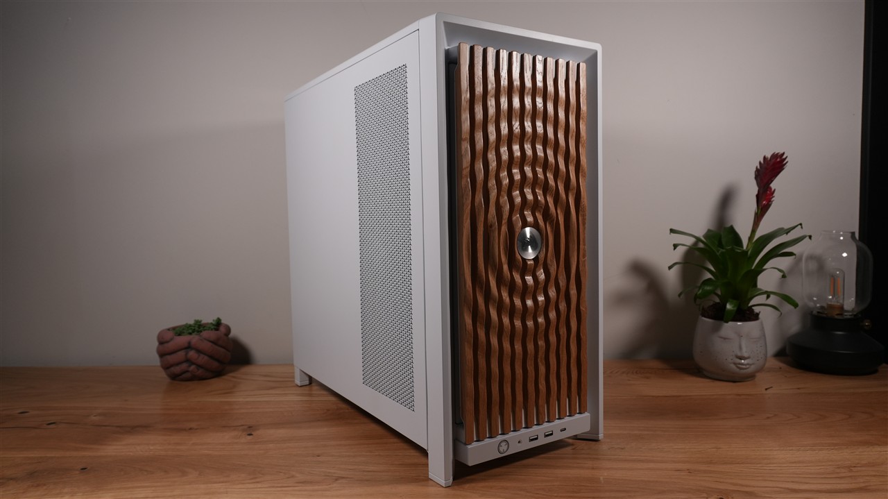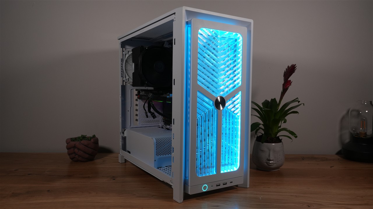 W fabrycznej konfiguracji obudowa ma gamingowy charakter. Głównie za sprawą podświetlanego frontu. Szkoda tylko, że diody LED nie znalazły się jeszcze w wentylatorach, bo dałoby do zdecydowanie lepszy efekt. Jak już też dobrze wiecie, efekt końcowy może być… bardzo różny. Jeśli wybierzecie jeden z drewnianych paneli to możecie uzyskać kompletnie inny charakter obudowy - bardziej stylowy. Szkła również można się pozbyć zastępując je klasycznym blaszanym panelem. Tak więc pełna dowolność.