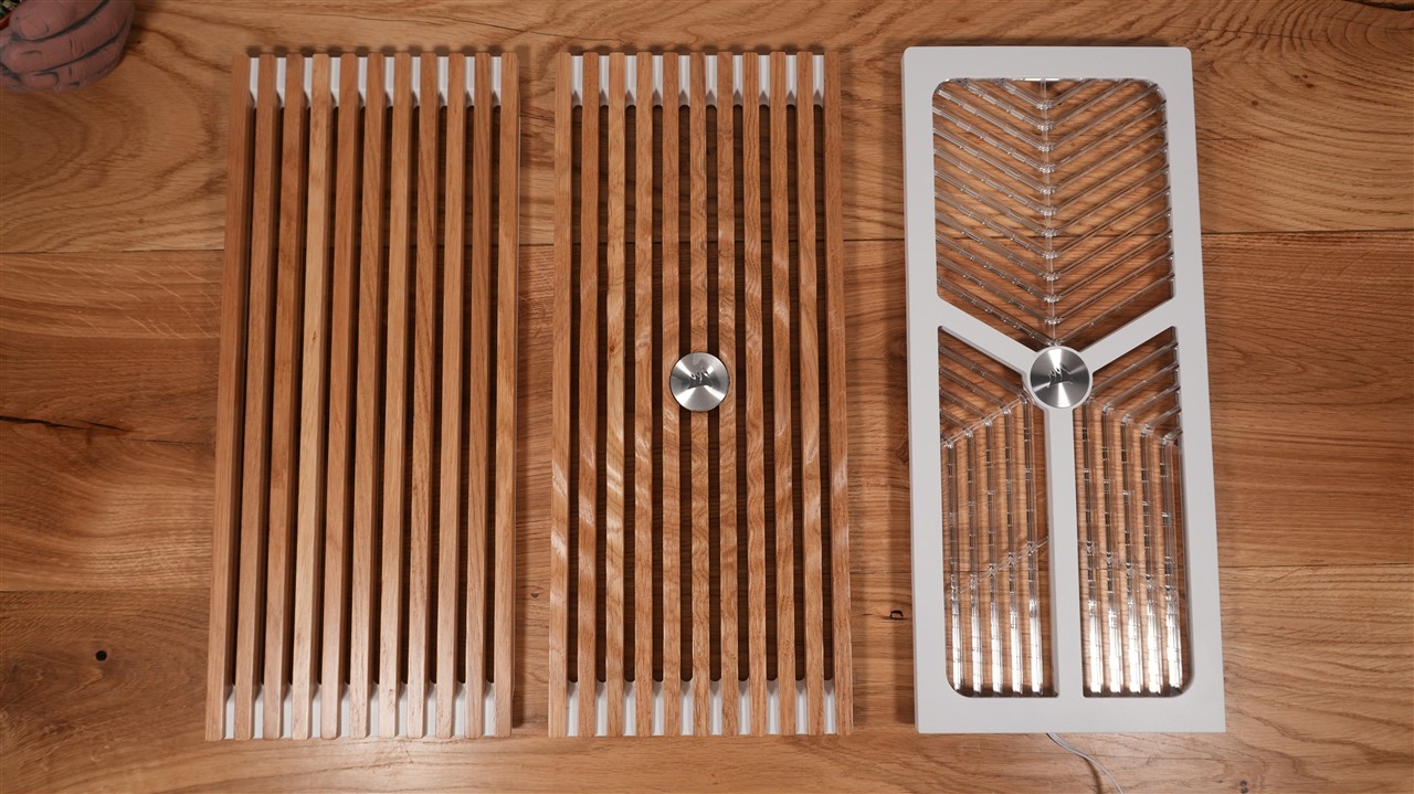 Zacznijmy sobie od panelu przedniego. Tutaj do dyspozycji mamy łącznie cztery opcje. Fabrycznie obudowa przyszła do mnie z panelem posiadającym przezroczyste lamele i podświetlenie. Posiada on zatem jeden 3-pinowy przewód ARGB. W pierwszej kolejności podmieniłem go na jeden z dwóch, które posiadają drewniane lamele i efekt był naprawdę mocny, bo obudowa kompletnie zmieniła swój charakter ze stricte gamingowego na coś bardziej eleganckiego. Następnie wypróbowałem panel ze stylizowanego szkła. Nie jest to zwykła tafla, bo posiada wzór składający się z wielu niewielkich kwadratów (nazywają to Pixel Glass). Najciekawszy okazał się jednak panel z falowanymi drewnianymi lamelami. Wygląda to jak drgający głośnik lub tafla wody, na którą przed momentem spadła kropla. Dodam jeszcze, że wszystkie te panele trzymają się na czterech kulkowych zatrzaskach, więc ich wymiana jest bardzo prosta.